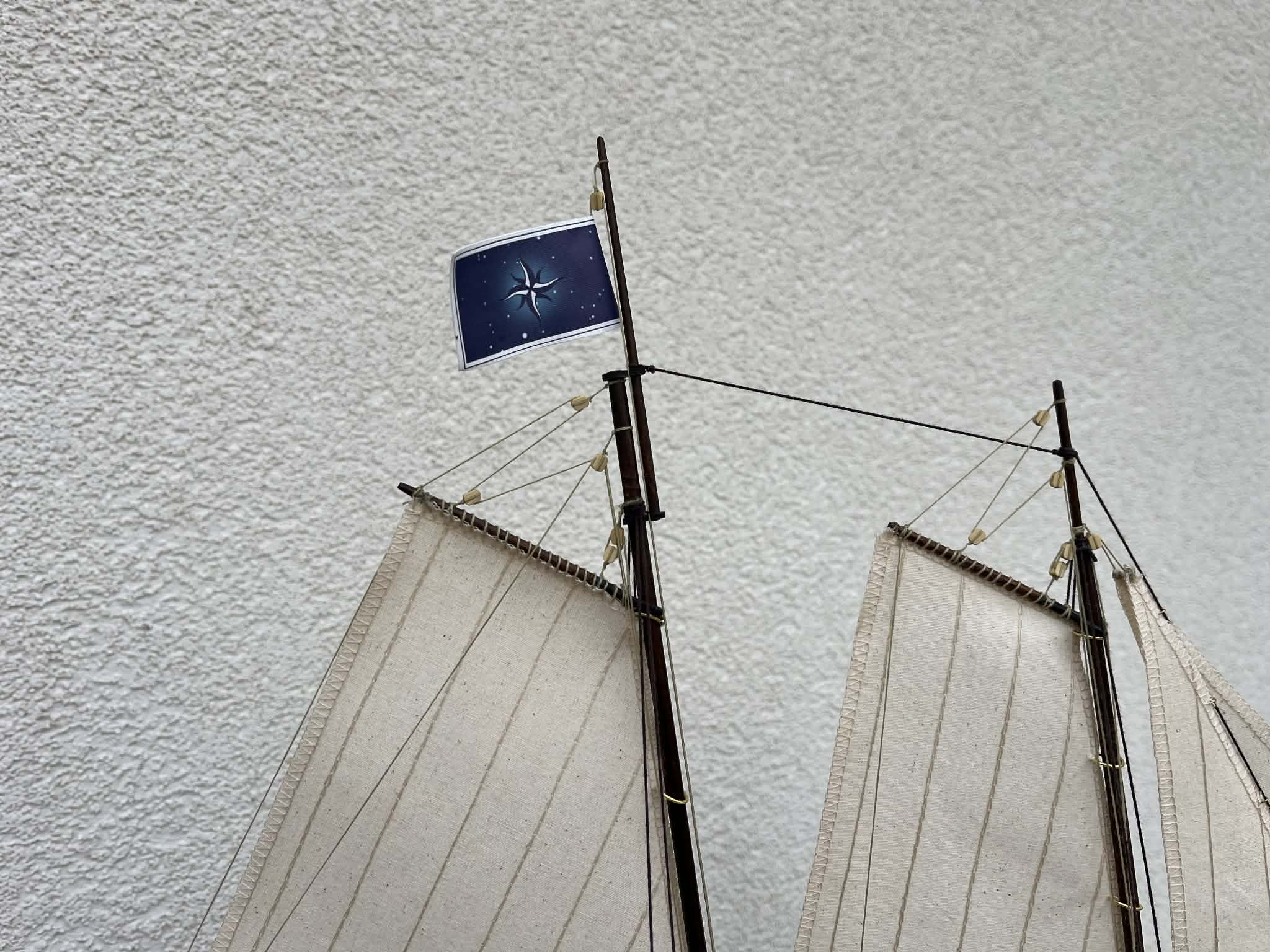Popracowałem nad masztami, wiążąc bloczki, uzbrajając je knagami oraz szpilami z oczkami. Przygotowałem i zamontowałem bukszpryt oraz osadziłem maszty w odpowiednim miejscu. Dodałem Bom do grotmasztu. Powiązałem część olinowania stałego masztu. Nie jestem do końca zadowolony z finalnego montowania blaszki na bukszprycie, ale próba zmiany może przynieść teraz więcej szkód - nauczka na przyszłość :/