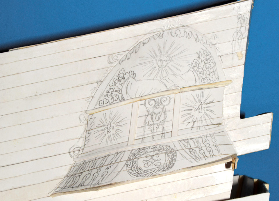 sugeruję, aby elementy zaznaczone strzałkami (z prawej) dać pod innym kątem, zbliżonym do modelu paryskiego (zdjęcie 2.) - przesunąć wieniec na środek (zdjęcie 1.) oraz element zaznaczony białą strzałką. Jeżeli to możliwe to sugerowałbym również zmienić kąt podpór tak jak na modelu paryskim (zdjęcie 2.), one idą po linii pawęży (patrz też rys. instrukcji Mantua powyżej). Użyłem określenia "jeżeli to możliwe" bo wiadomo te podpory muszą jeszcze korelować z balkonem poniżej i jego ozdobami (dobrze to widać na rys. Mantua).