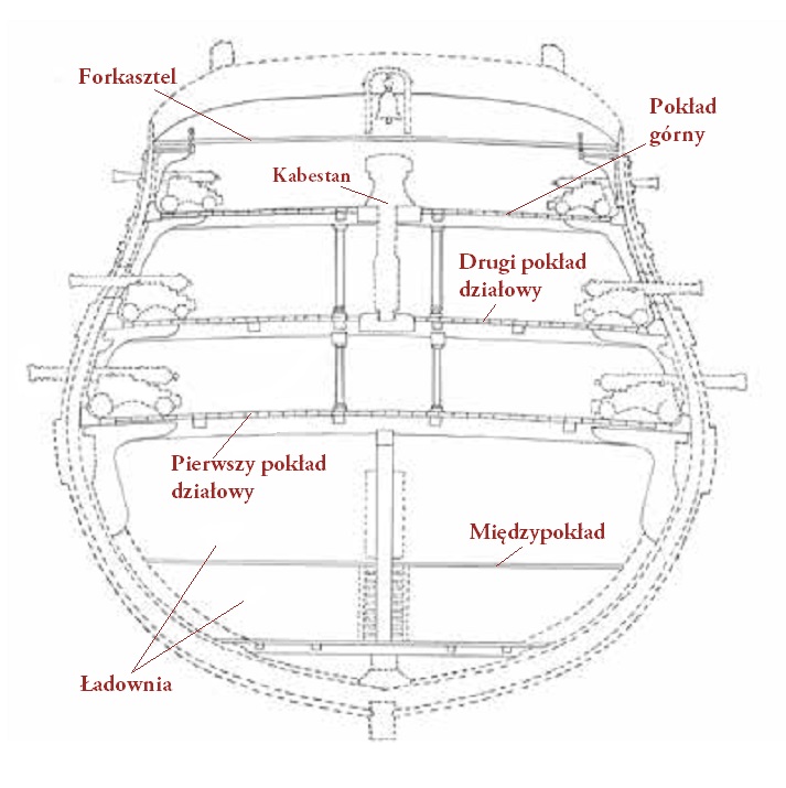 Wnętrze wielkiego siedemnastowiecznego galeonu było podzielone na kilka poziomów, czyli pokładów. Każdy z nich kryto deskami.