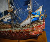 Budowa ostatniej ścianki zamykającej pokłady nie nastręcza problemów. Tak jak poprzednio przyklejałem listewki wcześniej pomalowane, co jest dużo łatwiejsze niż malowanie ścianki już zmontowanej. Do malowania na kolor czerwony elementów kadłuba używałem farby dostarczonej w zestawie wraz z innymi kolorami w ramach kolekcji. Farba dobrze kryje, jest trwała, bardzo szybko schnie i według mnie w zupełności spełnia wymagania skutecznego i estetycznego malowania modelu.