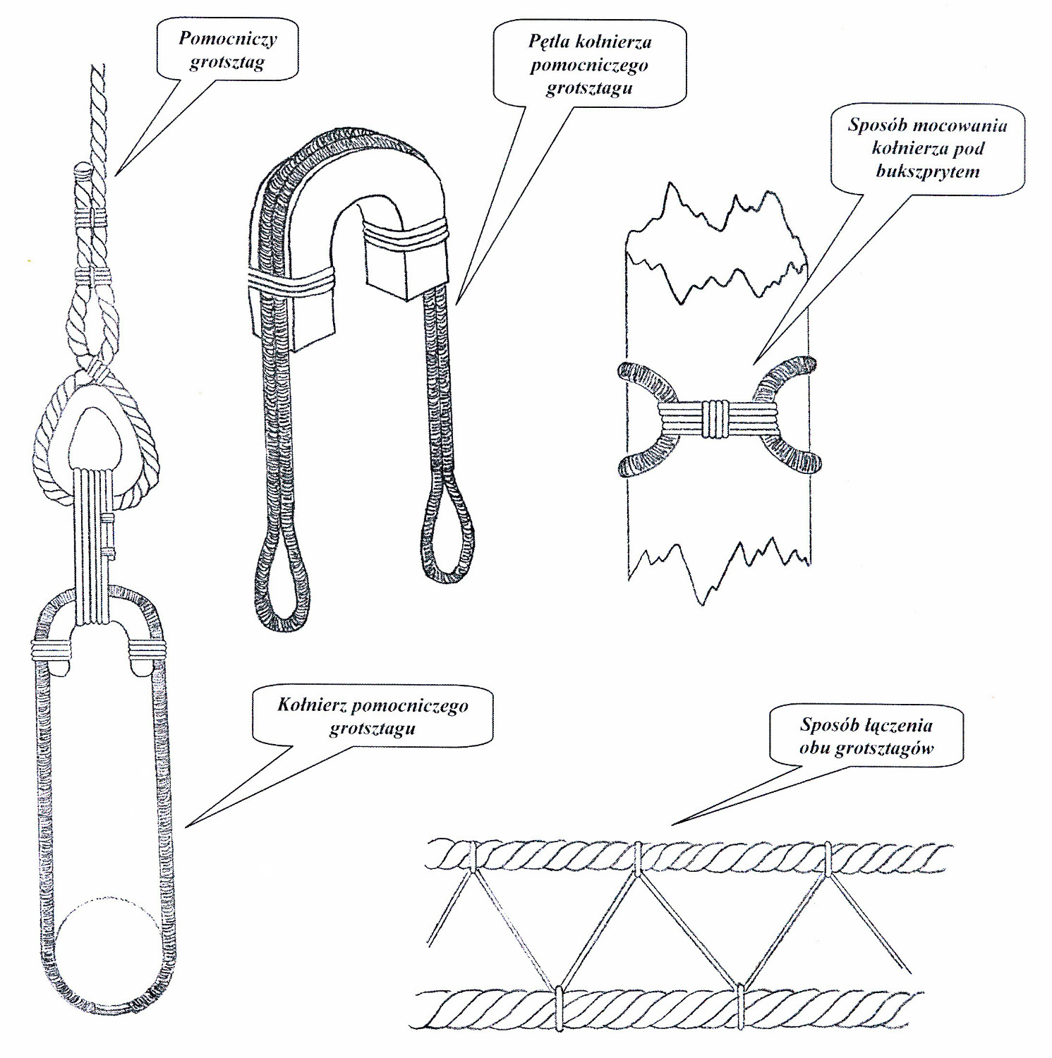 Żeby liny nie plątały się po pokładzie były klarowane w buchty (bez przewiązów) i zawieszane na kołkach wg poniższych schematów.