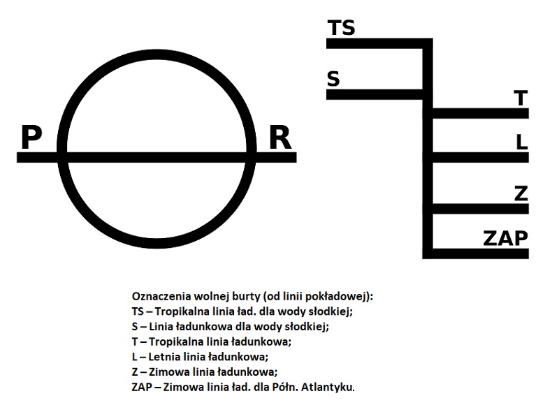 W kręgu wolnej burty znajdują się litery oznaczające towarzystwo klasyfikacyjne, z którego klasą pływa statek. Dla przykładu LR – Lloyd’s Register, PR – Polski Rejestr Statków, NV – Det Norske Veritas, BV – Bureau Veritas.