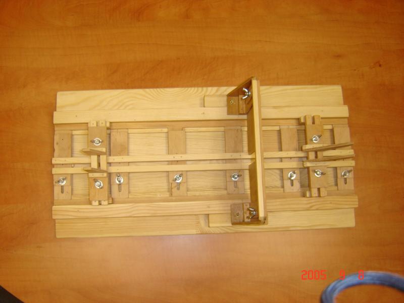 Jej długosc jest zblizona do 60cm (ma około 59cm dobrze nie pamietam). Jest wykonana na desce klejonej sosnowej z Castoramy. Wymiary poszczegolnych elementow torche odbiegają od podnych na stronie Mareckiego. Listwy zostaly po sklejeniu zakolkowane kolkami bambusowymi.