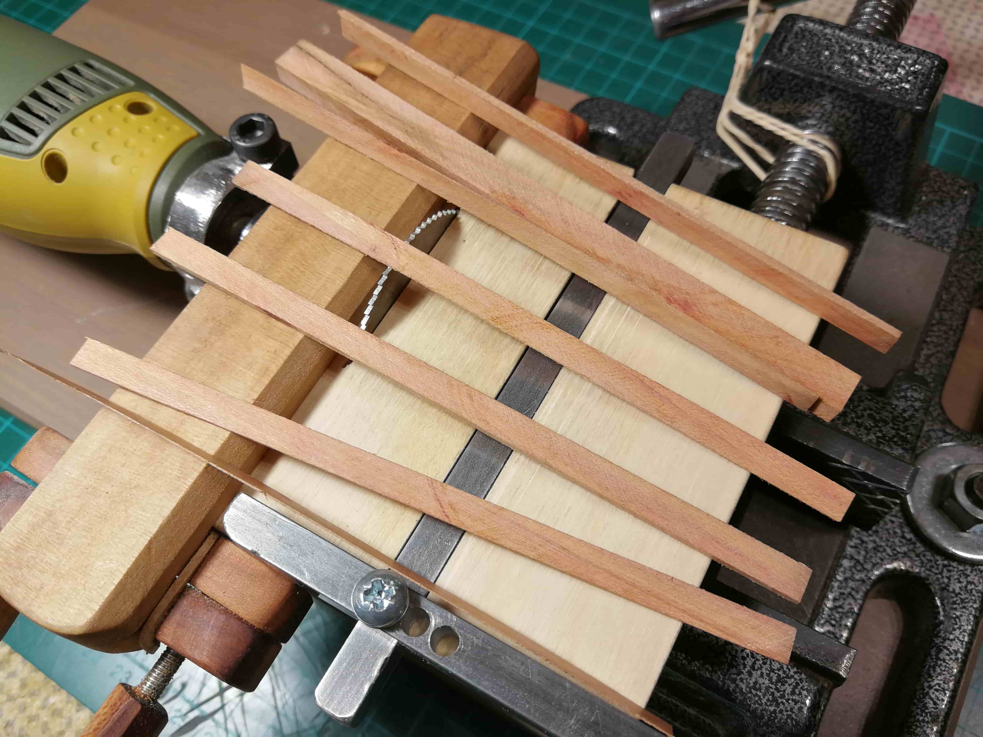 Stolik ze sklejki 3mm 10x10cm wzmocniony na krawędziach listewkami i banalnie proste zamocowanie w imadełku. Prowadnicę wzdłużną bardzo łatwo i precyzyjnie ustawia się na wymiar dzięki jej prostopadłości do stolika i długim prowadnicom po obu stronach. Wykonane są z drewna jabłoni w którym dało się bez problemu wykonać gwinty M4 do zaciskania prowadnicy.