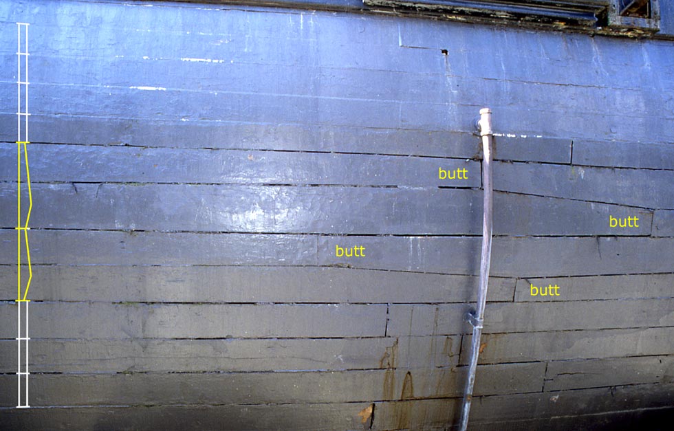 Top and Butt Planking na dolnej odbojnicy (Lower Wale), w czterech rzędach plus piąta prosta najwyższa listwa odbojowa.