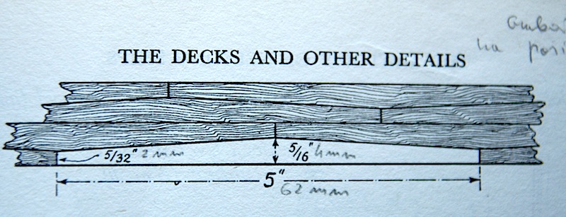 Grubość planek Longridge określił na 5/32" co przy skali 1:48 daje 4 mm. W książce nie ma natomiast układu kołkowania tych planek.