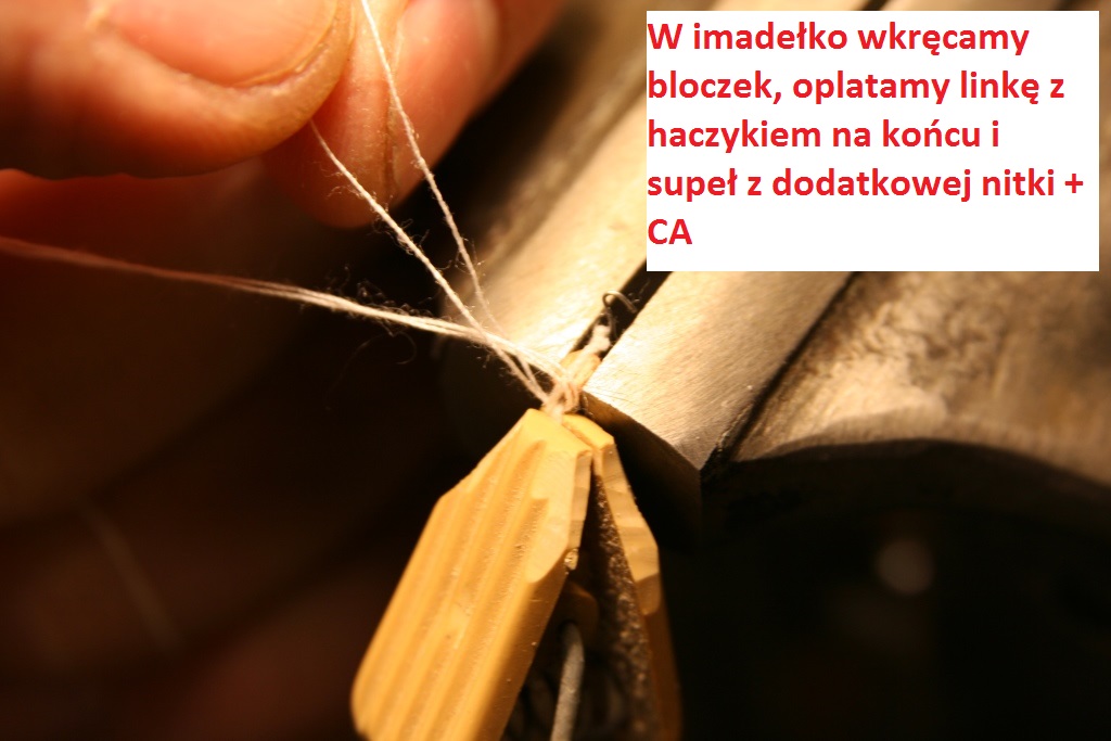Proszę, pokażcie, pomóżcie, jak "bezboleśnie" zawiązać, okleić lub ...cokolwiek zrobić, aby powstało 160 talii mocujących działa na okręcie. Nie mogę spędzić resztę życia przy tym. Próbowałem kilka sposobów. Bloczek średnica 3mm jednoszybrowy. Potrzeba umocować hak 2 mm. i przewlec linę talii. Bloczki oczywiście od Mirka. Świetny wyrób. Powiedzcie czym to przykleić do bloczka, lub jak przywiązać, aby nie wylądować w domu wariatów przy 10 sztuce. Ja już się "kończę". Jak jestem spokojny z natury, to TO postawiło mnie w "stan alarmowy"
