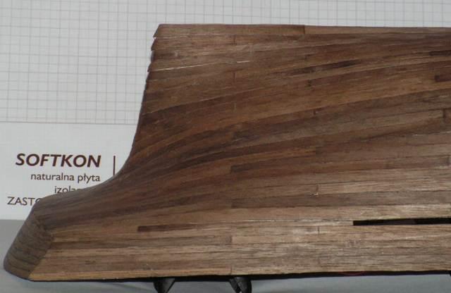 Ja powiem tak:mamy dwa przykłady poszycia kadłuba jedno listewkami drugie fornirem obydwa dobre.Jeśli chodzi o poszycie listewkowe na styk łatwiej jest pokryć jedną listewką przez cały kadłub i zaznaczyć imitację łączenia niż z poszczególnych desek gdzie łączenia muszą być na wrędze (czesto trzeba wstawiać dodatkową aby było to jak w planach.Poszycie z forniru możemy też robić z jednego kawałka a potem zaznaczyć łączenie desek lub jak Zbyszek z poszczególnych desek.Wszystko zależy od posiadanego materiału .