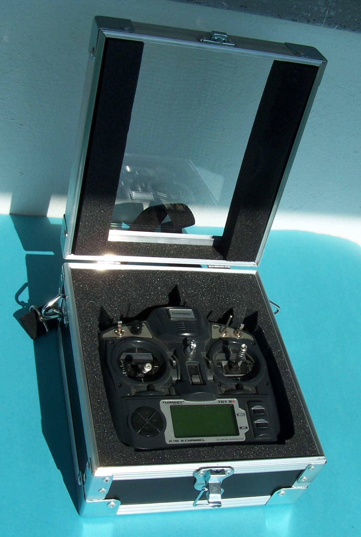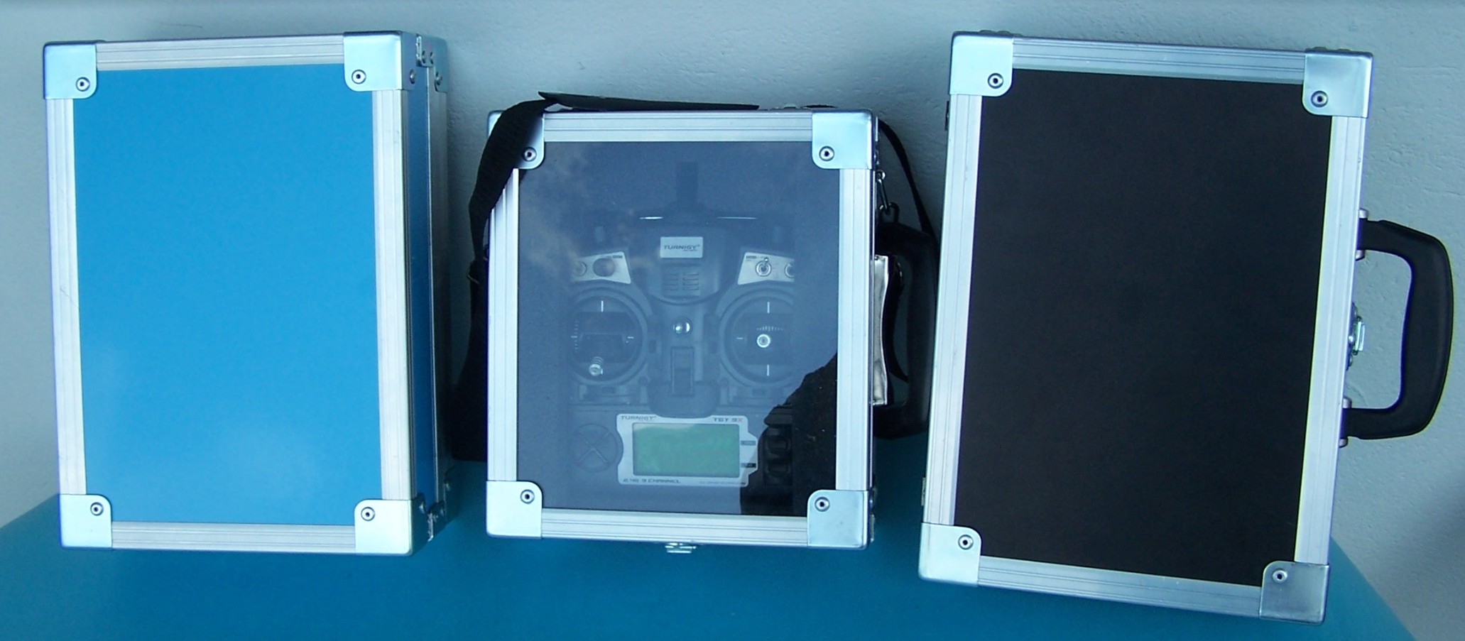 Skrzyneczka na aparaturę RC . Można ochronić naszą wypieszczoną maskotkę przed trudami transportu i warunków panujących nad wodą czy lotnisku .Skrzynkę można wewnątrz wyłożyć grafitowa pianką co dodatkowo ochroni nasz sprzęt . Skrzynki są wykonane z kształtowników aluminiowych produkowanych specjalnie do tego typu skrzyń . Walizki na gitary , mikrofony i tym podobne .W każdej walizce możliwe jest wykonanie wieczka z pleksi 4 mm . natomiast ścianki wykonane są ze sklejki 4 mm . lakierowanej lub oklejonej folią o dowolnym kolorze i fakturze .