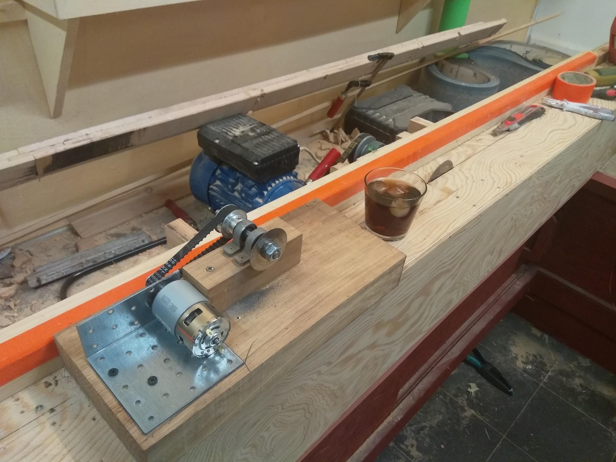 Mnie jednak ciekawi motor. Czy mógłbym się dowiedzieć co to za jeden, gdzie kupić i za ile? Czy to na 12V czy może na 230V? Planuję zrobić coś takiego do cięcia b.cienkich listewek i podoba mi się jego długa ośka. Te koła pod pasek zębaty też ciekawią mnie gdzie kupić i pasek też.