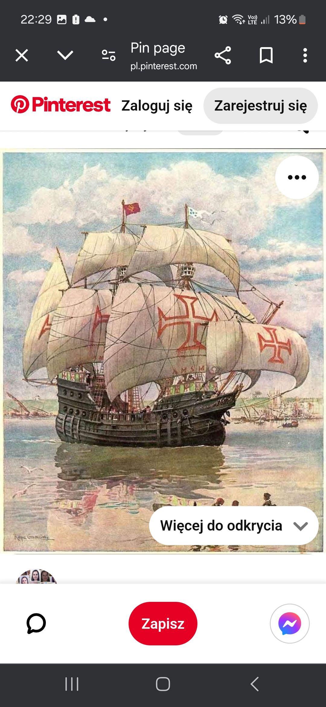 Co do krzyża na żaglach to kojarzy się z: czarnym średniowiecznym krzyżem templariuszy maltańskich. "Klasyczni" templariusze mieli czerwone krzyże z tego co pamiętam. Zakon krzyżacki to o wiele lepszy trop. Poniżej link z fotografią okrętów krzyżackich z podobnym krzyżem i foto w załączniku, https://www.polityka.pl/pomocnikhistory ... kiego.read podążając tym tropem może: https://histmag.org/Bitwa-na-Zalewie-Wi ... akow-17417 Ciekawostka, warto posłuchać: Podsumowując jeśli to nie bardzo swobodna wizja artystyczna to na podstawie krzyża na żaglach i sylwetki obstawiałbym że to statek budowany na podobieństwo do statku krzyżackiego, gdyż galeon hiszpański lub templariuszy raczej miałby czerwony krzyż o nieco innym kształcie. Dobrej nocy