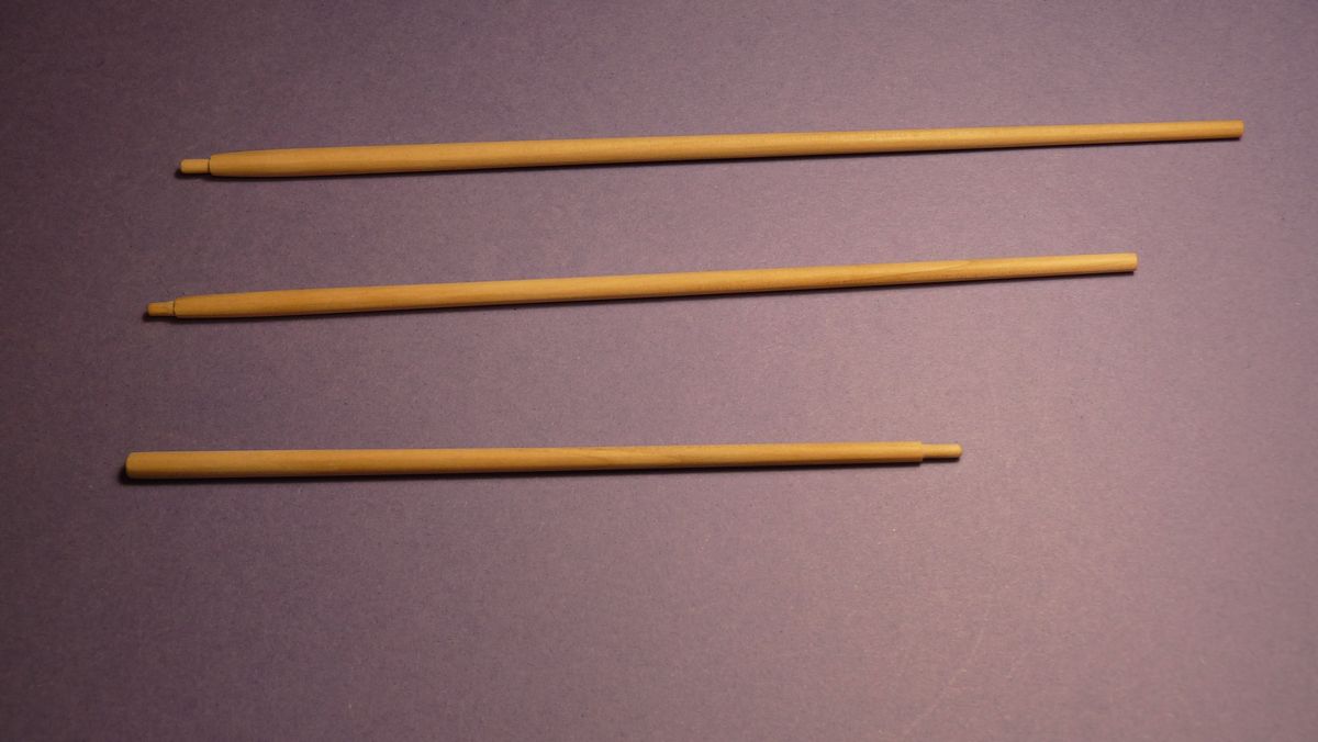 Z mojego doświadczenia polecam drewno leszczyny. To materiał bardzo jasny, elastyczny( nawet bardzo cienkie drzewca są odporne na złamania), dobrze się go obrabia, słoje mało widoczne, doskonale można go wygładzić i wykończyć powierzchnię w dowolny sposób. Drewno oczywiście nie do kupienia, ale można je pozyskać z naszych lasów nie wyrządzając szkody upatrzonemu drzewu. Trzeba tylko odciąć długi prosty i dość gruby odrost( ca 40 mm). Nie pozbawiać kory i suszyć bez szokowych temperatur przez co najmniej 4 miesiące, ale bez zmian wilgotności. Po takim czasie wykrawamy próbną listewkę i sprawdzamy czy się nie rzuci. Warto unikać samego środka przy małych średnicach.Nawet 40 letnie flagsztoki mające średnicę 2-3 mm są proste jak drut. Polecam ten łatwo dostępny materiał. Myślę, że wielu się do niego przekona