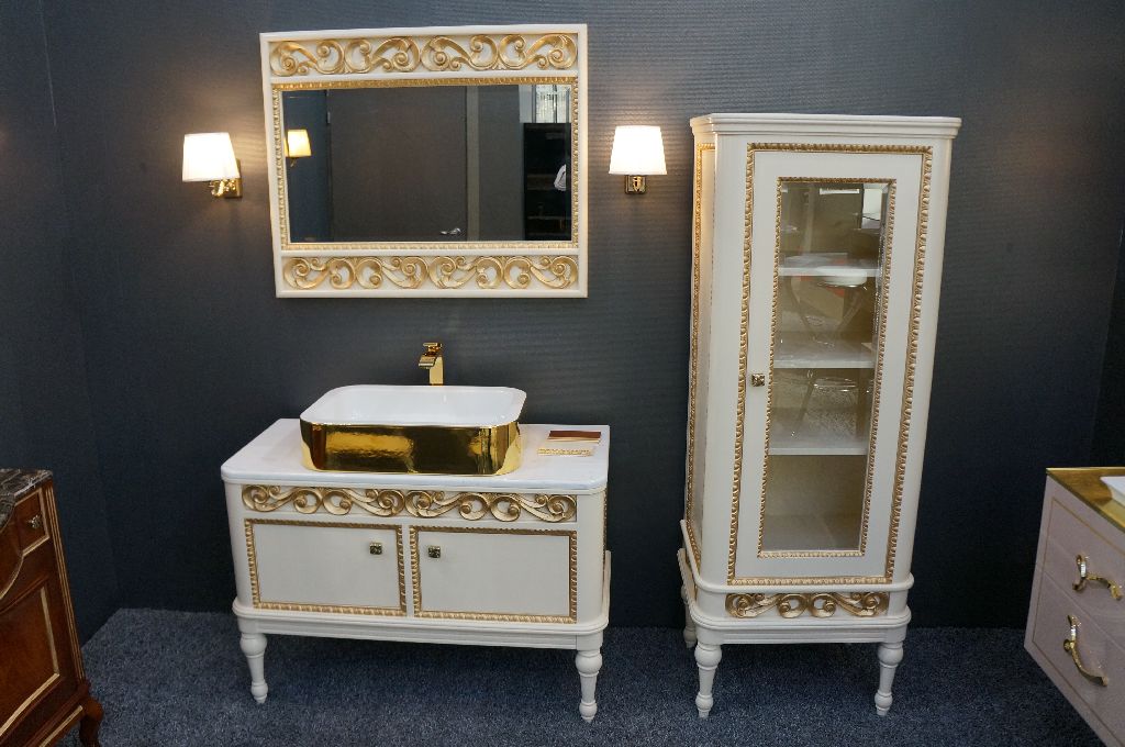 Te akurat będą w jakiś salonach łazienkowych w Baku. U nich musi się wszystko swiecić. Zastanawiam się czy nie wprowadzić wersji dla leniwych na lakierze złotym Motip . Do tego idzie tona listew. I foto z tegorocznych targów Mosbuild w Moskwie