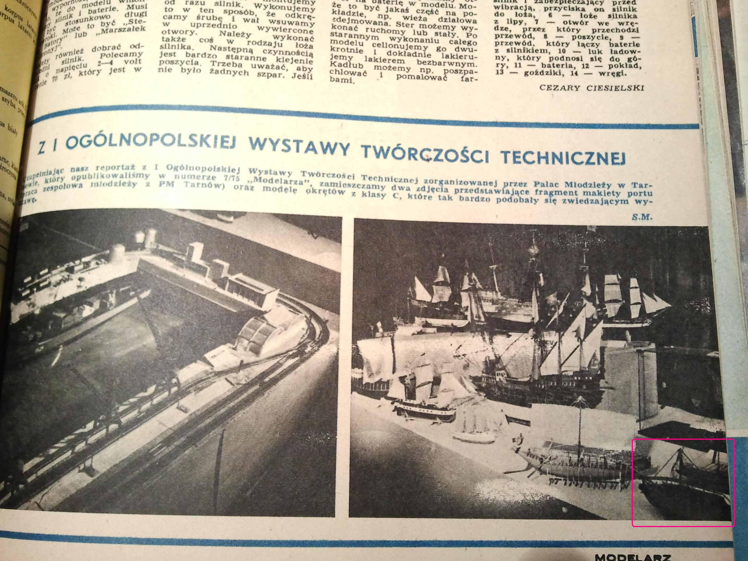Moja pierwsza poważna wystawa i model greckiego statku handlowego w/g planów zamieszczonych w książce "Budowa modeli dawnych żaglowców".Relacja w Modelarzu nr 7i8/1975r.Mój model w ramce.