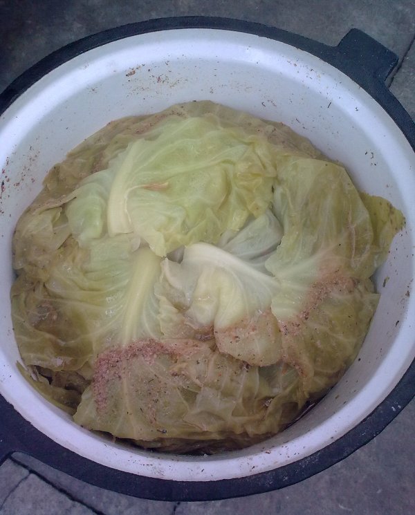 Zawartość to ułożone warstwami pokrojone w kostkę- plastry, ziemniaki, mięso peklowane, boczek, kiełbasa zwyczajna, cebula, czosnek, przyprawione solą pieprzem. zewnętrzna warstwa to liście białej kapusty, które zapobiegają przypaleniu potrawy. Można też dodać pieczarki lub grzyby świerze i trochę jarzyn, jak marchewka, seler. Niestety zdjęcia samej potrawy nie zdążyłem zrobić, bo znika błyskawicznie. Oczywiście można w tym robić różne potrawy, pomysłów jest sporo. Dla mnie najlepsze danie to peklowana golonka w kapuście.