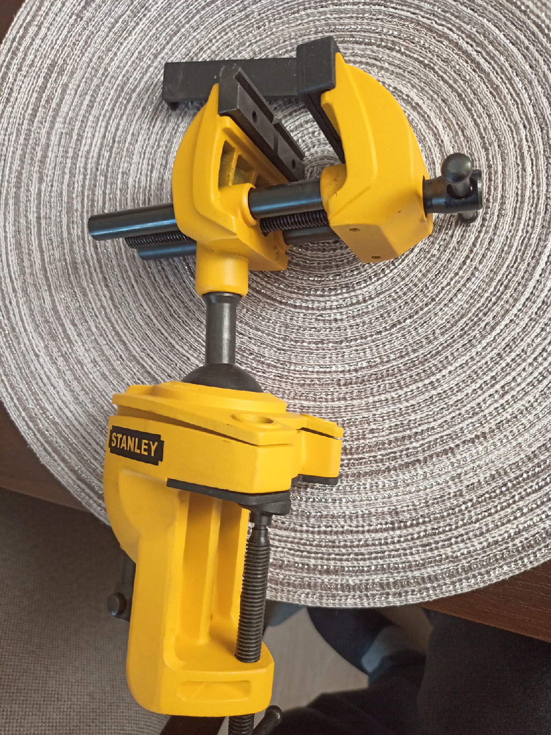 Na razie kręcę linki i robię zakupy, m.in. takie oto coś. Imadełko jak imadełko, ma wszystko co potrzeba: kulisty uchwyt, miękkie nakładki na szczęki, spory rozstaw tychże, twarde szczęki mają rowki do wałków.