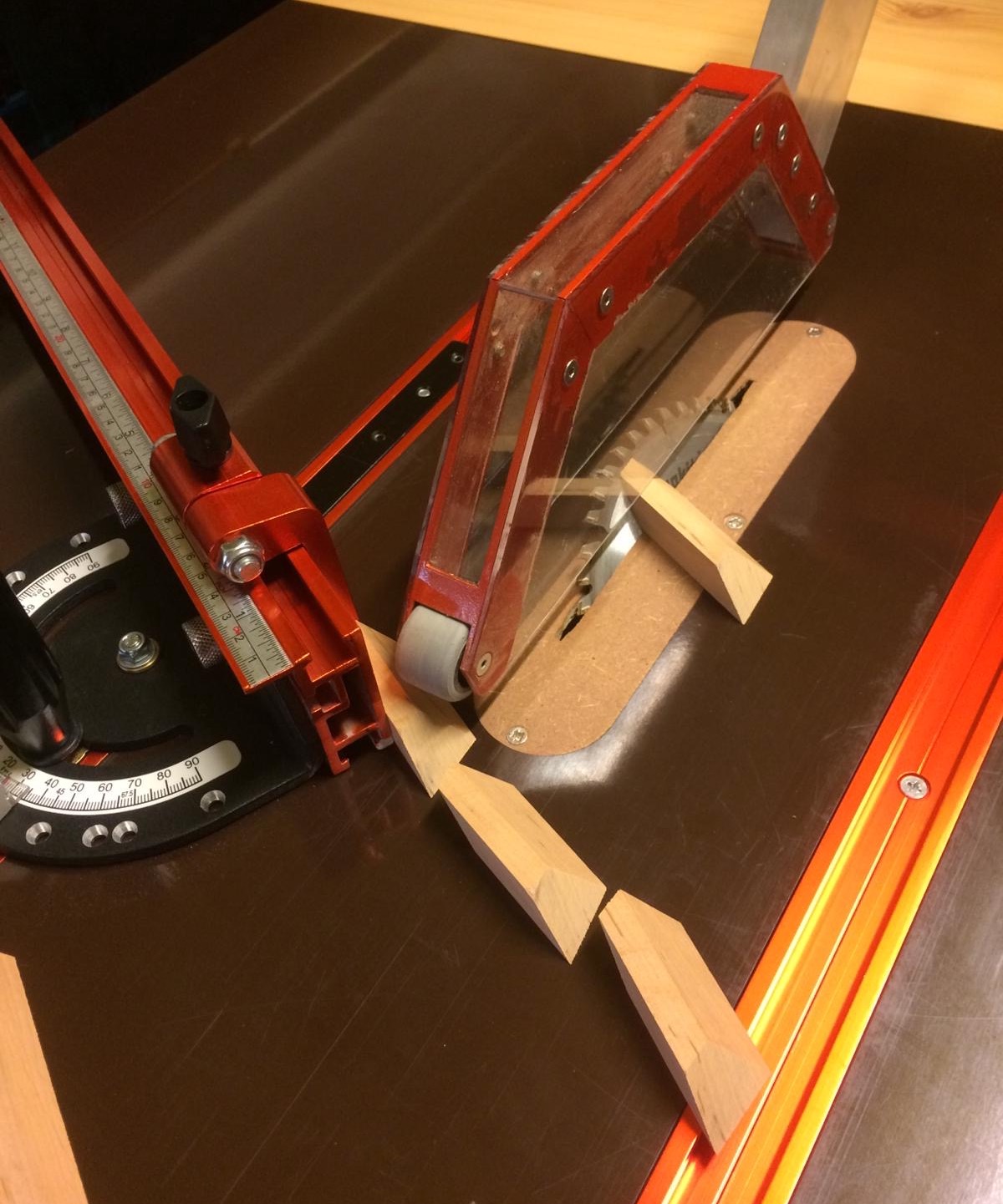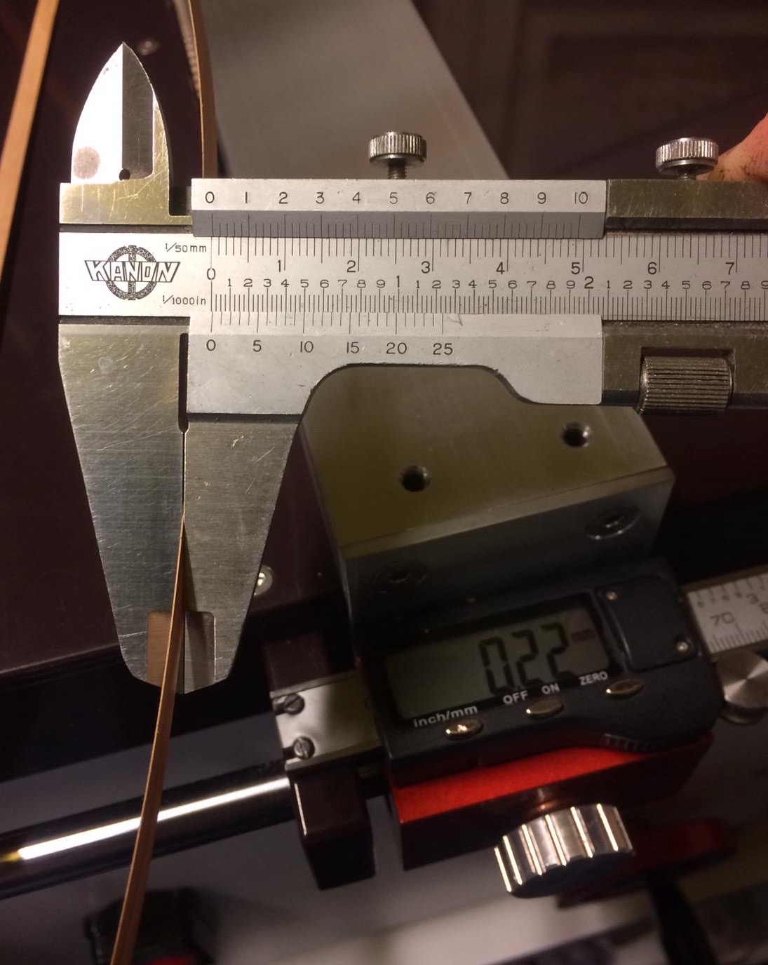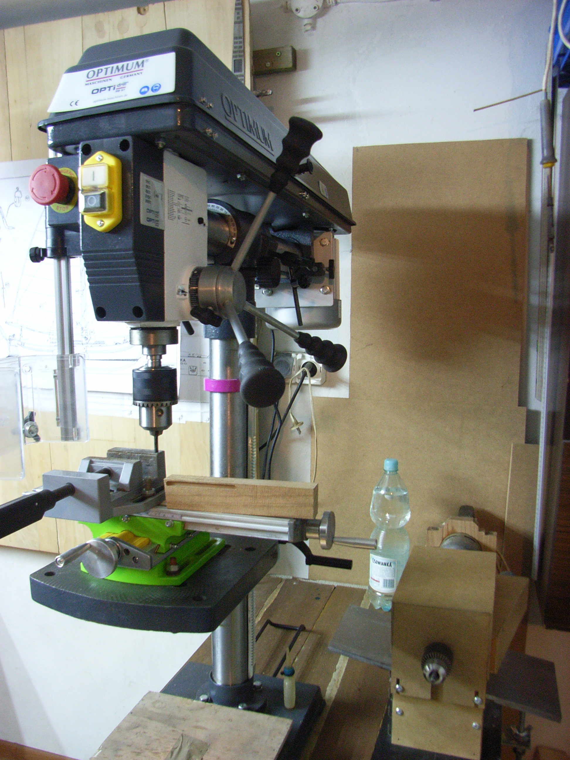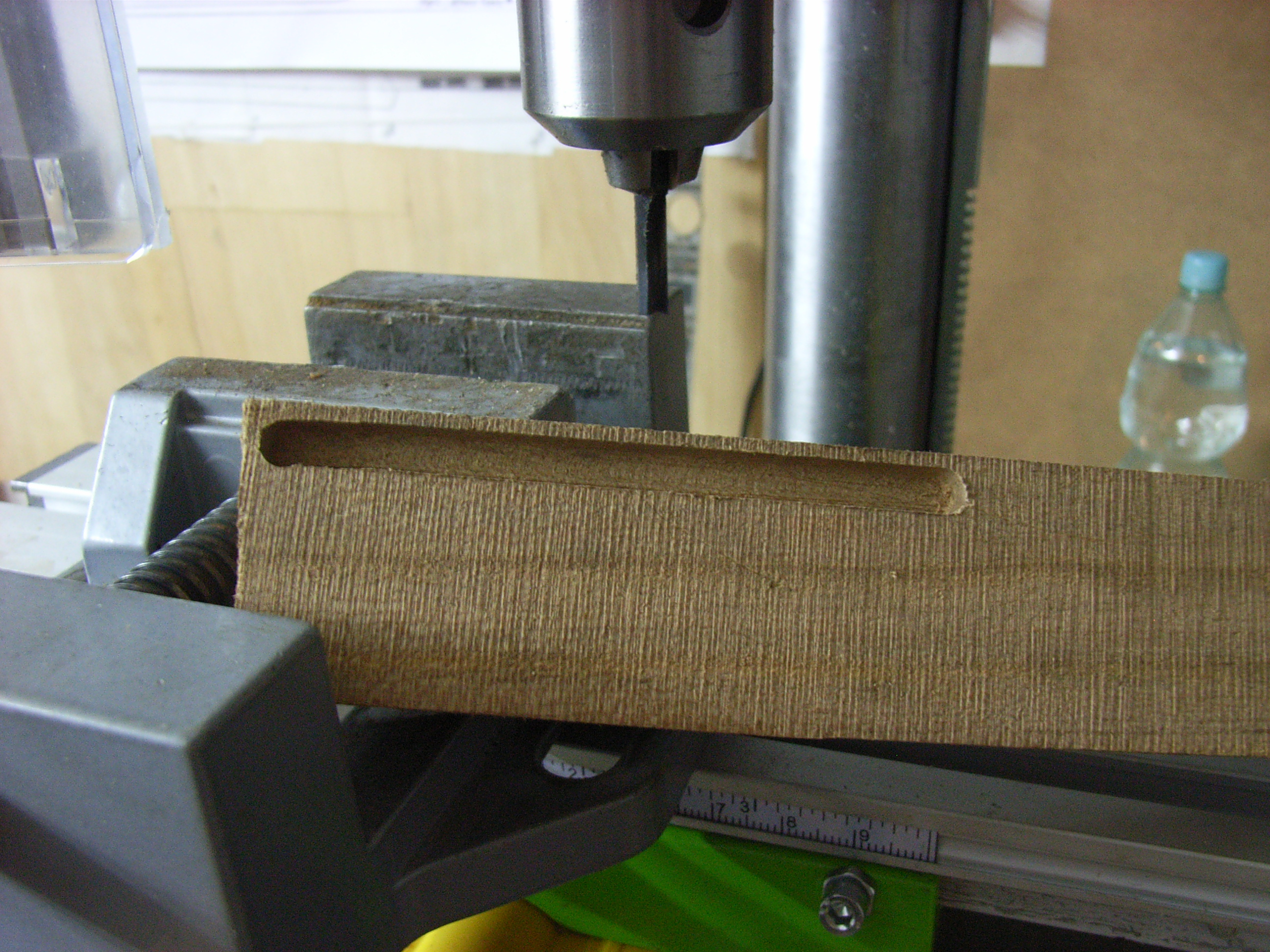 Przymiarka stolika krzyżowego (modelarskiego) do dużej maszyny. Da się zamontować bez problemów. A na nim imadło maszynowe. Do wiercenia i frezowania drobnych modelarskich elementów w drewnie i metalach kolorowych jak najbardziej. Do frezowania stali muszę kupić inny stół krzyżowy do tych prac dedykowany. A oto pierwsza próba frezowania rowka w drewnie bukowym.,