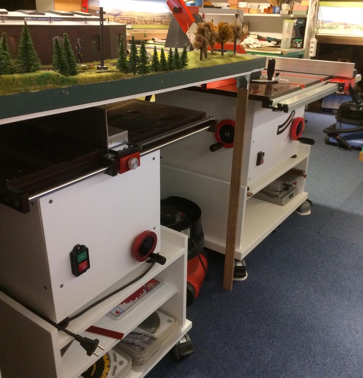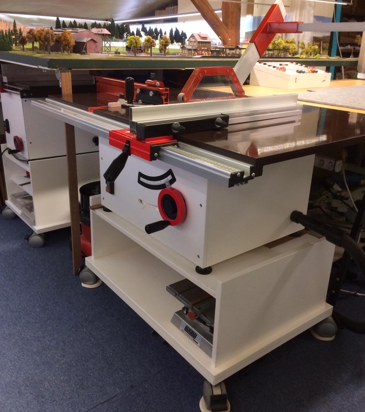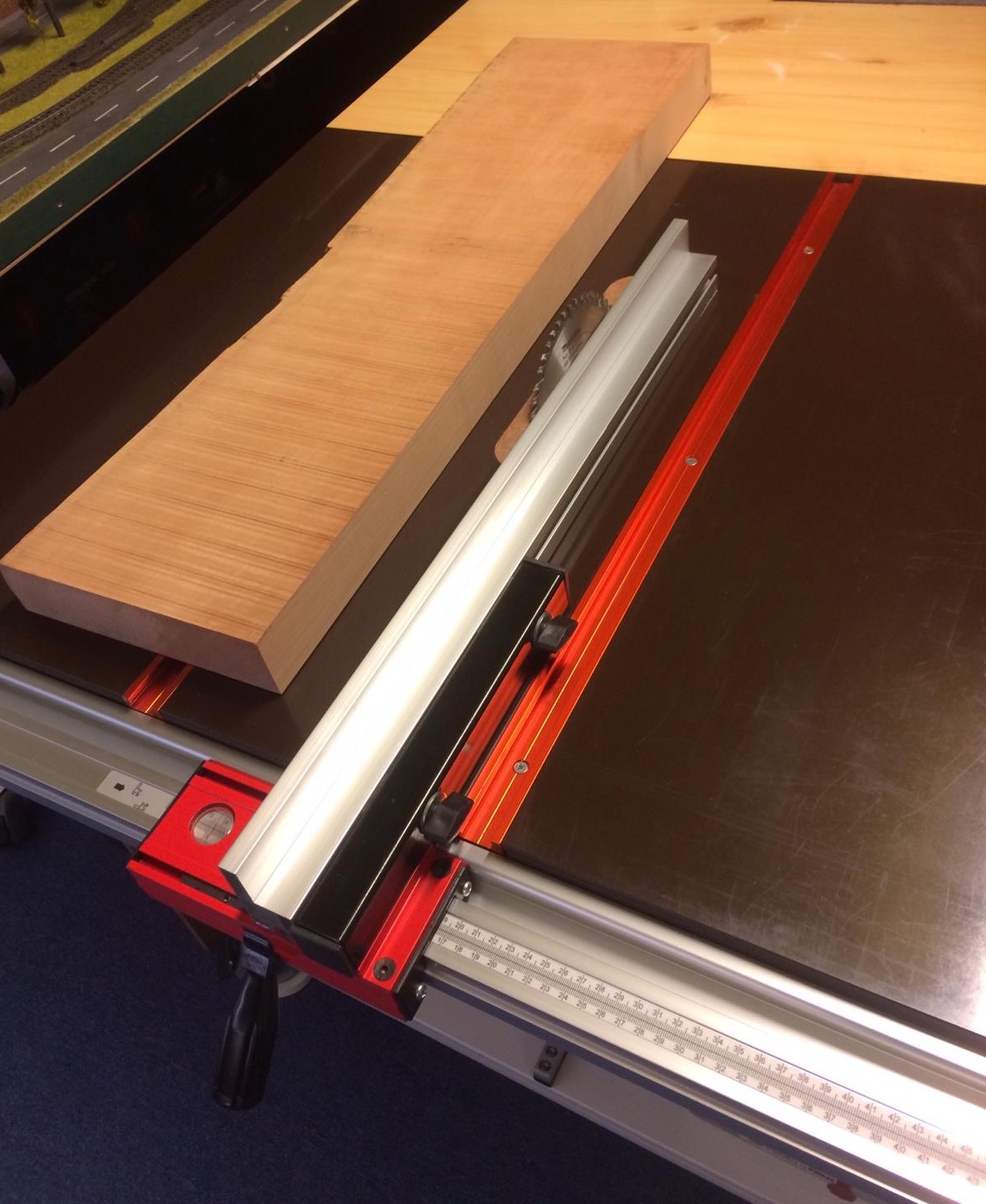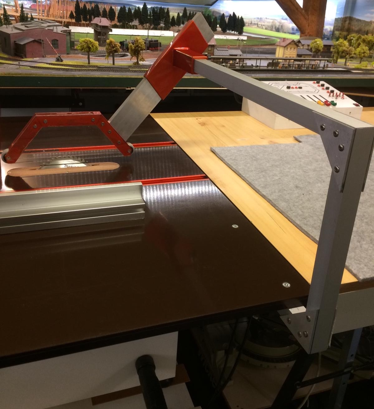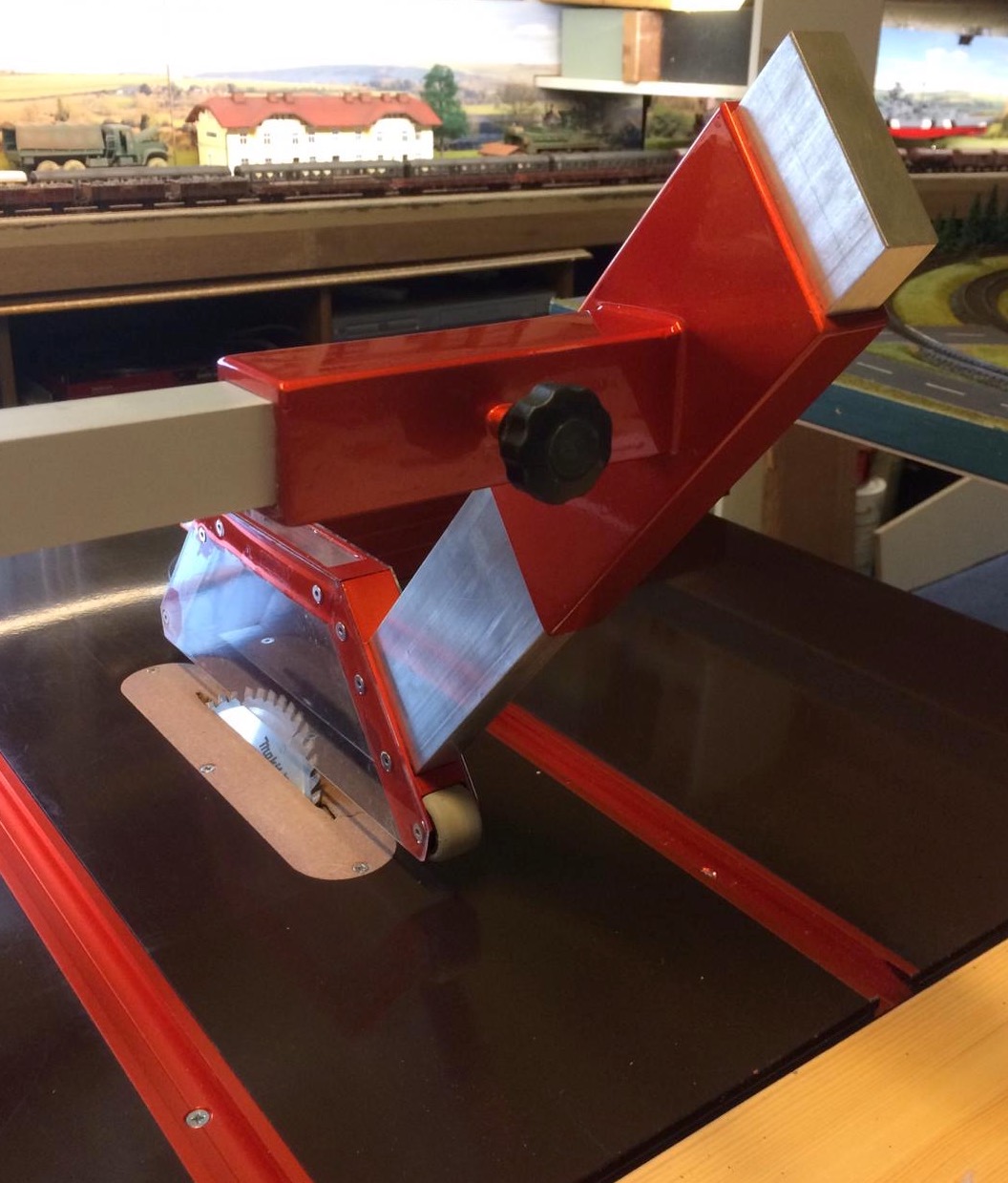 Duża ma blat 1000x700 mm na silniku zagłębiarki Makity SP6000J 1300 W. Wysokość cięcia to 52 mm. Posiada możliwość cięcia pod kątem 0-45 stopni. Bardzo fajnie tnie i co najważniejsze nie wpada w wibracje i nie wali pyłem w modelarnię.