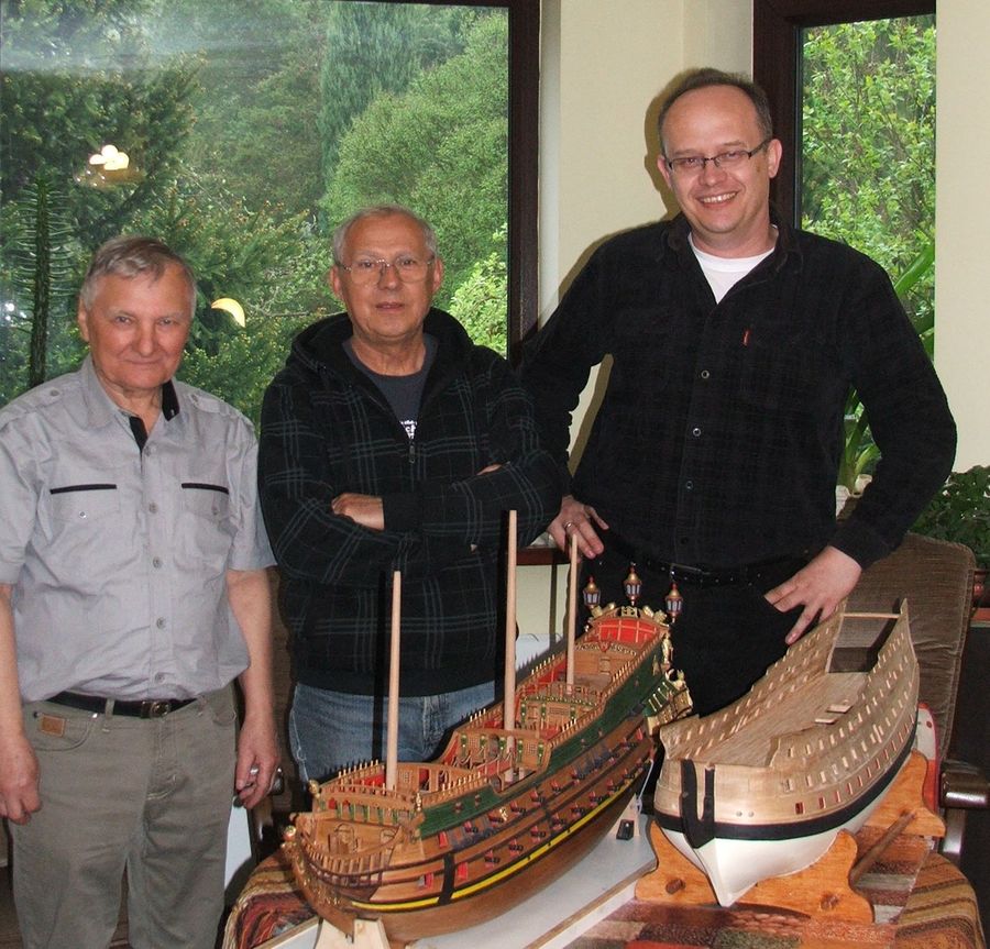 Wczoraj odwiedził mnie Adam (Oksal) i Kazek (kagra}.Bardzo miłe koleżeńskie spotkanie.Miałem wielką przyjemność obejrzeć ich modele w budowie.Piękna stolarka" Wappen von Hamburg" i aż niewiarygodne że budowa zajęła tylko 1,5 roku.Dobrze wysycone i dobrane kolory burt i pokładów.Royal Wiliam budowany z kopyta.Ciekawa technologia którą miałem okazję zobaczyć i poznać zalety i wady.Pracy jeszcze sporo ale to tylko ja i Kaziu mamy więcej czasu.Odwiedzili moje piwniczne królestwo.Adam niestety musiał chodzić z przechyloną główką a ja i Kazek mieściliśmy się z dużym luzem.Czas mijał szybko i żałuję bardzo że dzielą nas spore odległości.Pogoda niestety nie dopisała bo planowałem pokaz lotu samolotem.Trzeba kontynuować takie wzajemne odwiedziny i kontakty bo pozwalają podładować akumulatory i nabrać ochoty na dalszą pracę.Przychodzi taki moment kiedy ma się już dość dłubania ale wizyta i pogawędki z kolegami pozwalają przebrnąć stagnację.R