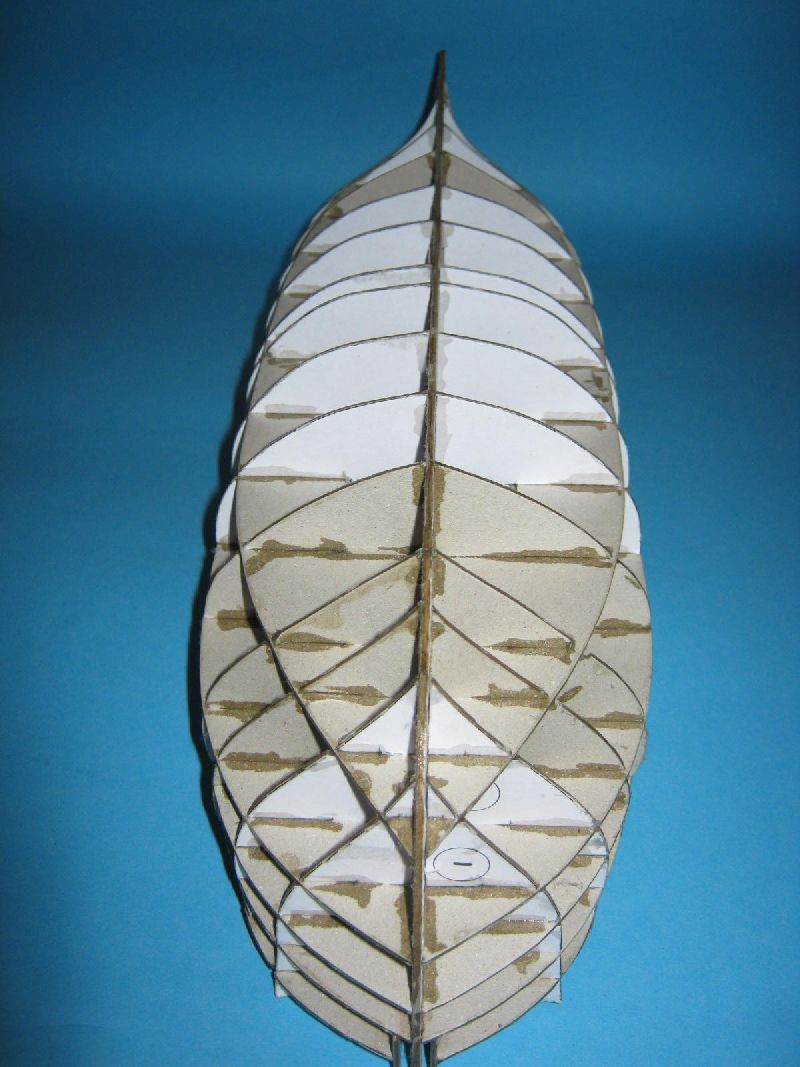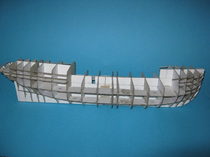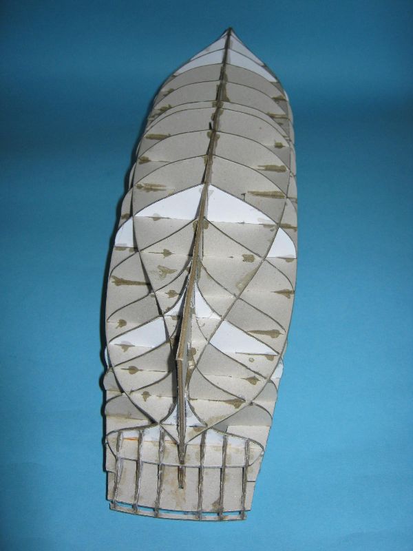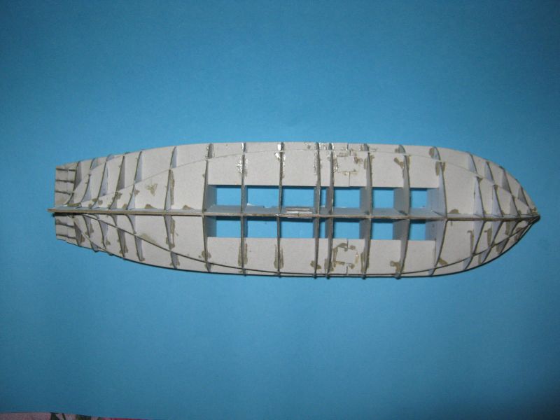 Kadłub jest sklejony prosto i sztywno a brzegi wręgów nasączone super glue, przygotowany pod piankowanie.