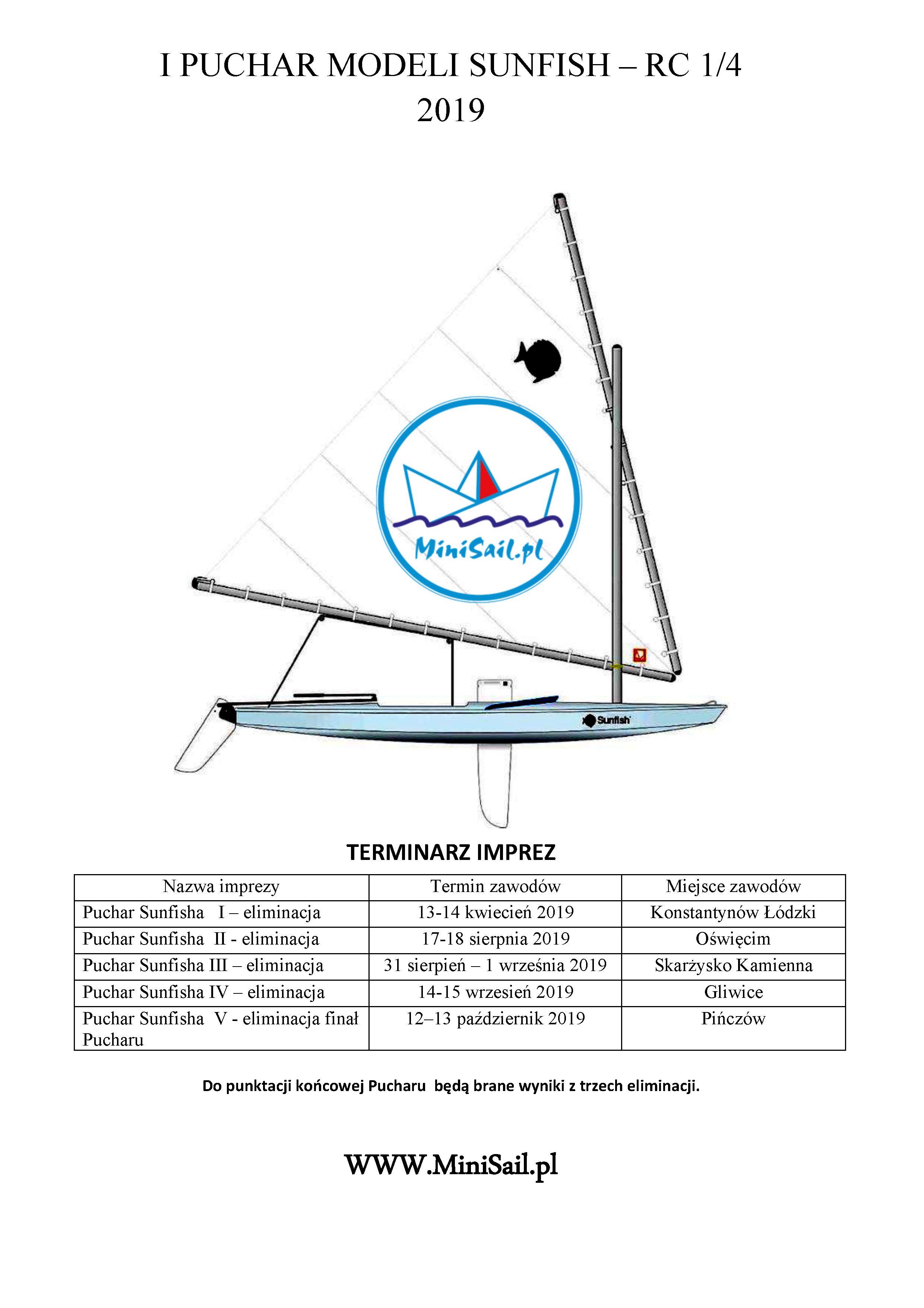 Zapraszamy na I Puchar Klasy Sunfish – RC 2019, (Sunfish Minisail Cup®) – regulamin na stronie http://www.minisail.pl/index.php/klasa- ... regulamin/ . Wszystkie spotkania nowego cyklu znajdziecie na plakacie.