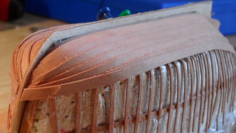 Na pewno deski poszycia nie mogą być tej samej szerokości na całej długości szalupy. Jeśli poszycie jest np z 5mm szerokości deseczek to zauważ że na rufie będzie ok 3-4mm, na śródokręciu najwięcej czyli 5mm a zbliżając się do dziobu planka powinna być cieniowana do ok 2mm
