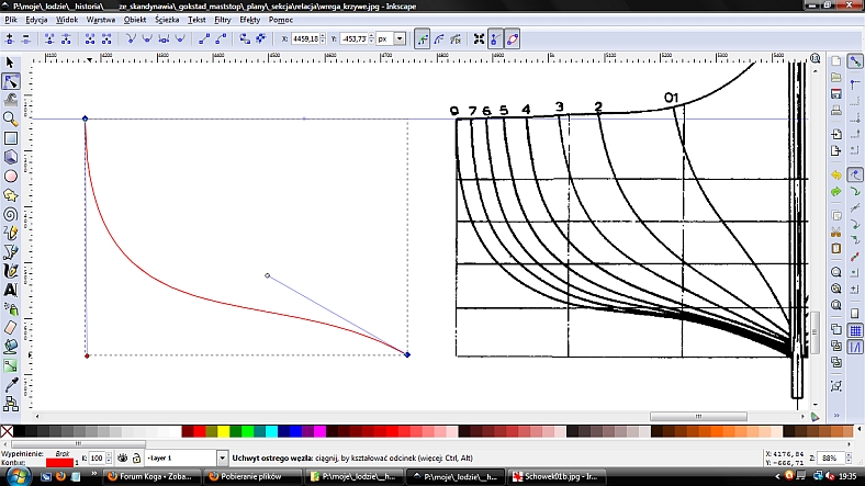 Większość osób dodaje punkty/węzły na takiej linii, ja jednak ograniczam się do dwóch skrajnych i ustawiam je odpowiednio, co może jest bardziej czasochłonne, ale w mojej ocenie daje lepszy efekt (wystarczy porównać duże zbliżenia). W ten sposób wykreślam krzywą teoretyczną wręgi, na podstawie której następnie "instaluję" (rysuję) elementy które ją tworzą.