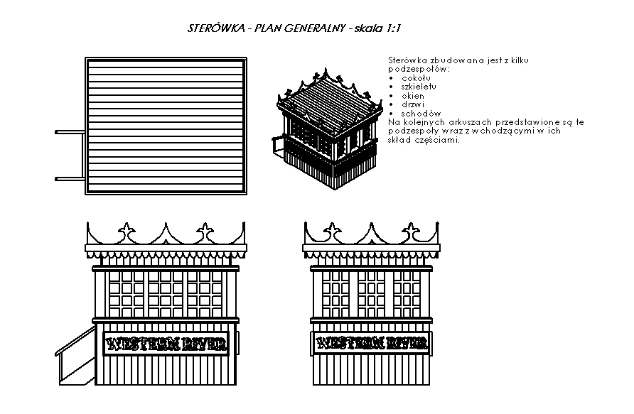 Na rysunkach dokumentacja sterówki. Plan generalny i rysunki zespołów z detalami. Sterówka składa się z cokołu, szkieletu, okien, drzwi i schodków.