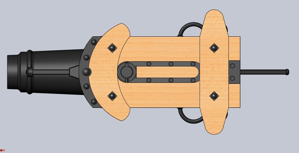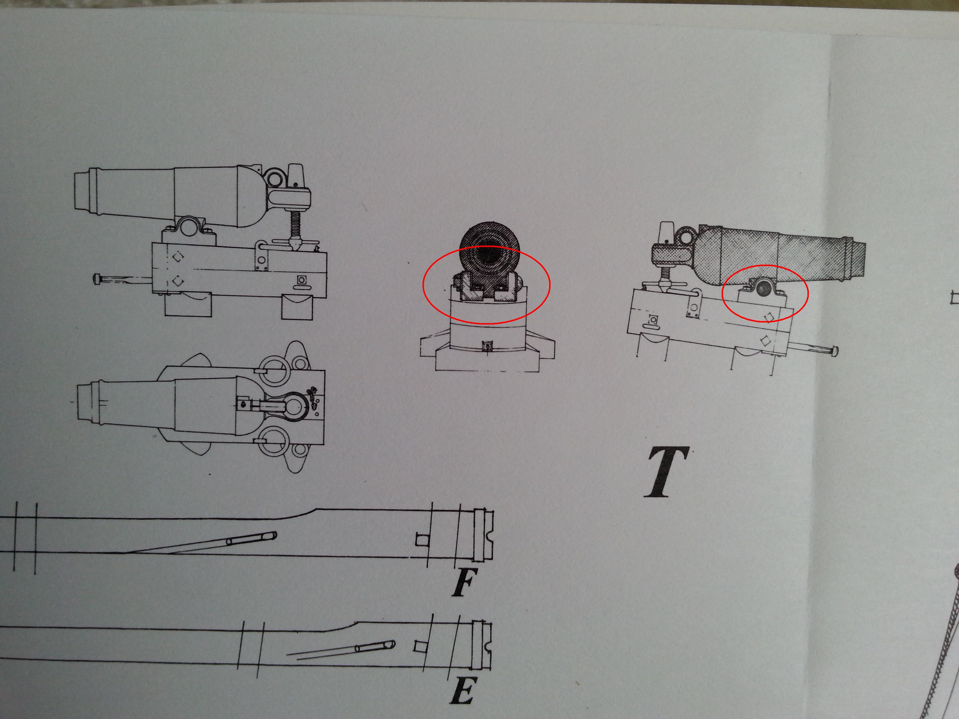 W karonadzie zastosowałeś czopy mocujące z klasycznej armaty.Karonada miała jeden ruchomy czop przechodzący na wylot przez otwór wypustu mocującego odlanego razem z lufą i klinowany.