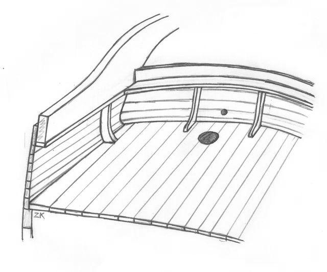 Zastanawiam się czy wzmocnienia burt nie lepiej by było wklejąć po ułożeniu pokładu będzie łatwiej. ....... A tak później się tylko je naklejy na burty i do pokładu, aby usztywnić burty to łatwiej będzie wywiercić otworki w wmocnieniach i pokładzie i klejć na patyczki do pokładu i przykleić do burty.