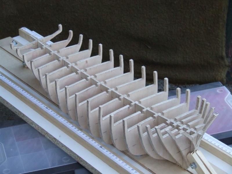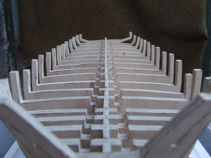 Maciek wskazał zkrzywienie podłużnicy, a ja chciałbym abyś przyjrzał się ustawieniu dwum ostatnim rufowym wręgom na tym zdjęciu. Według mnie są przekoszone. Aby je wyprostować należało by z jednej strony podszlifować wcięcie we wręgach. Będziesz sklejał szkielet w stoczni, więc zwróć szczególną uwagę na prostopadłość wręg i jednakową wysokość końca wręgi na prawej i lewej burcie. Podłużnice wklej na końcu kiedy klej na wręgach dostatecznie się utwardzi. One mają tylko usztywnić szkielet.