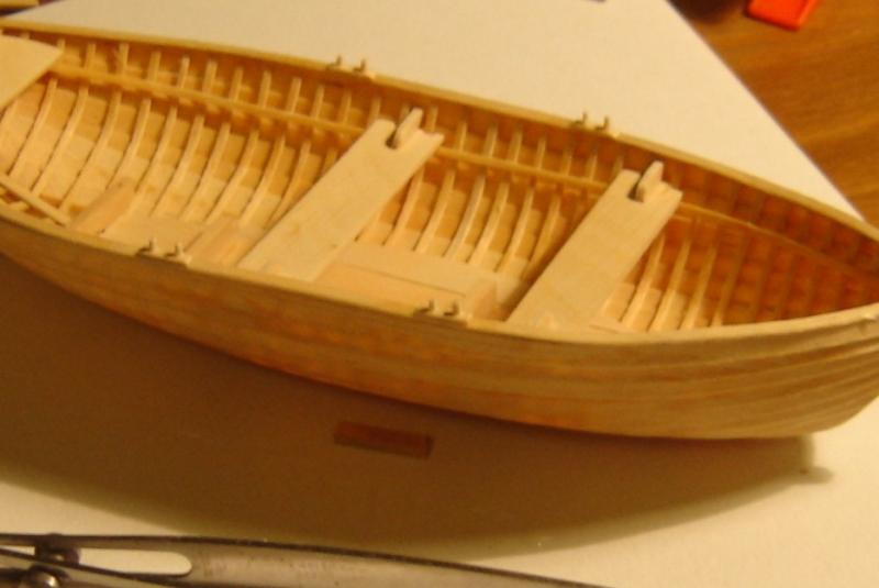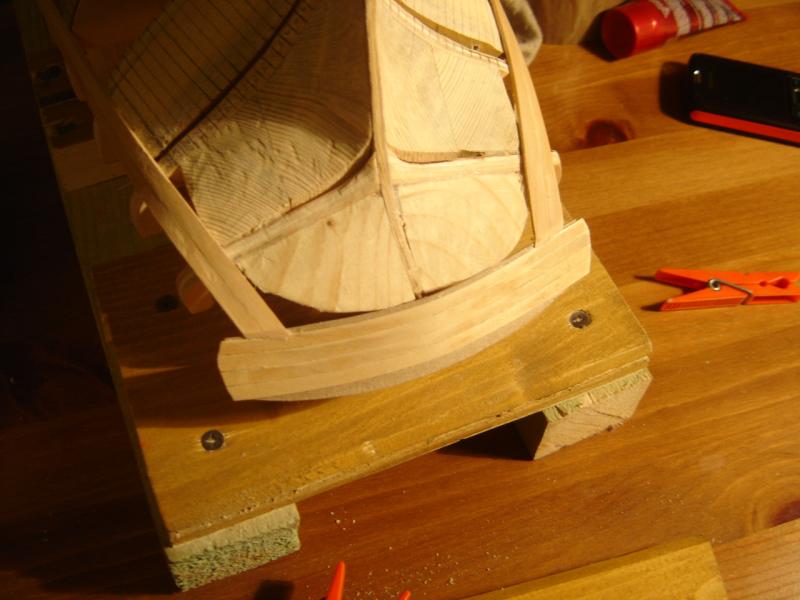 Wobec powyższego postanowiłem te 3 ostatnie listwy po każdej stronie dokleić jedna do drugiej nie trzymając się szerokości wręgi. Następnie do tak zrobionej szalupy doprofiluję wręgi. Zdjąłem szalupę z kopyta....