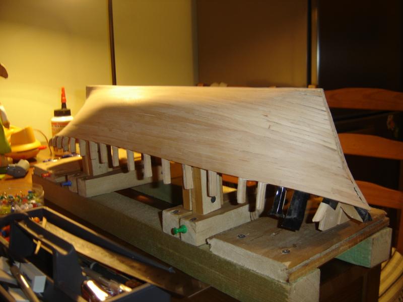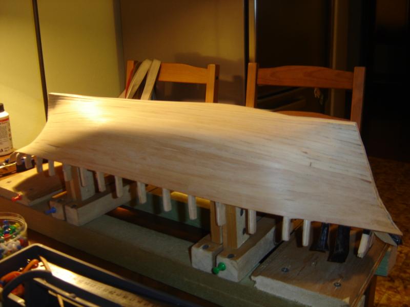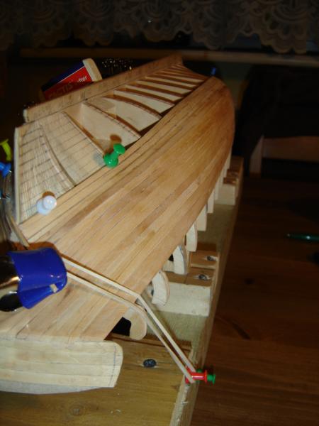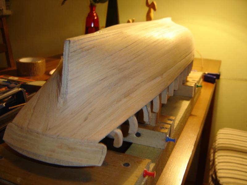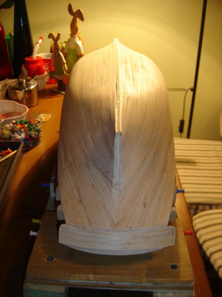 Przedstawiam fotki z dotychczasowych prac. Poszycie na ukończeniu, pozostało dorobienie burt czyli 7-miu 3-milimetrowych listewek. Następnie czeka mnie wykonanie kilu i dopasowanie go do kadłuba. Na zdjęciach widać, że kadłub nie jest idealny, ale jeszcze nie jest ostatecznie wyszlifowany, będzie to dopiero można zrobić przy dopasowywaniu kadłuba i kilu. Nie wiem czy uda się go wyprowadzić na "zero", ale to się jeszcze okaże w swoim czasie. Poniżej fotki, zapraszam do obejrzenia. Jakiekolwiek uwagi mile widziane.