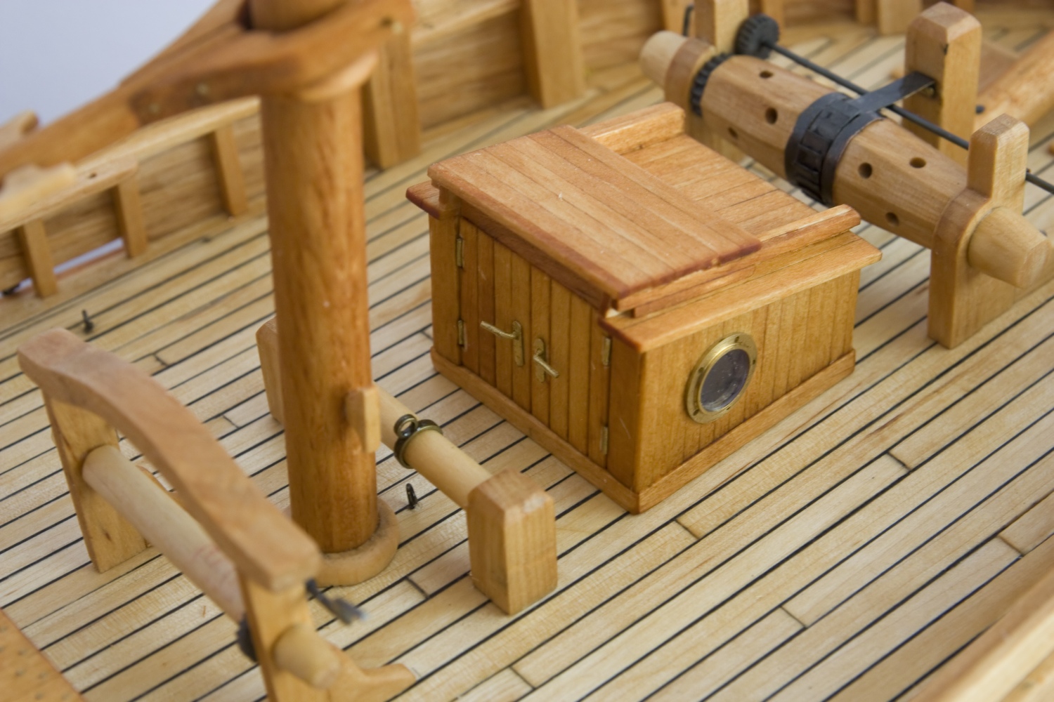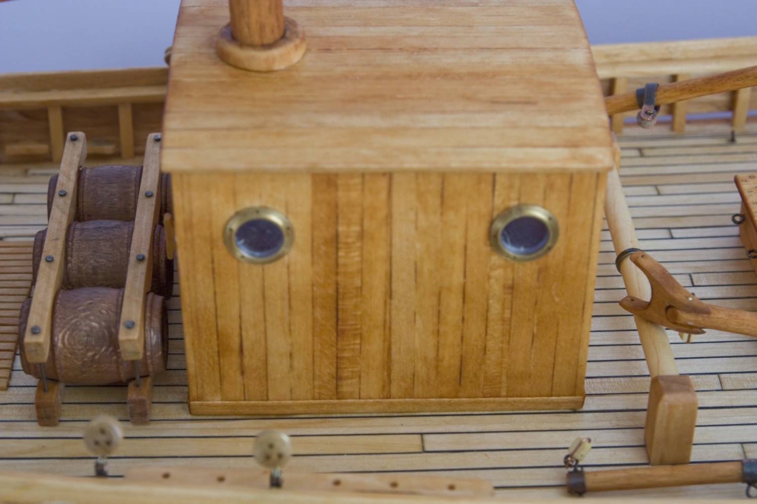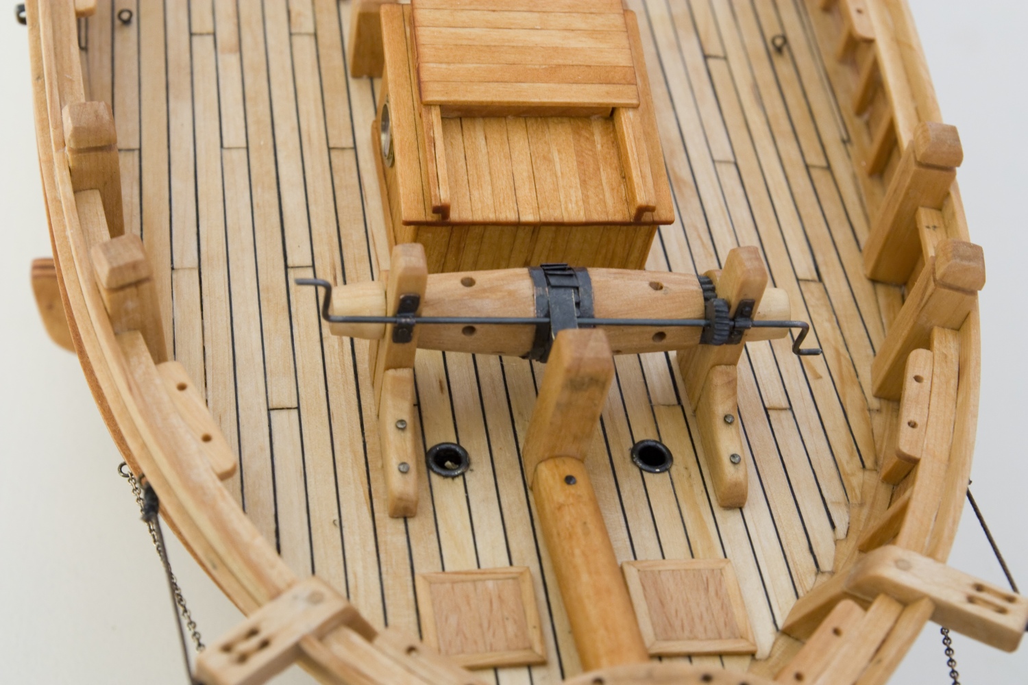 Kadłub wykonany jest z olchy a wszystkie nadbudówki z listewek z topoli i pomalowane bejcą olcha.