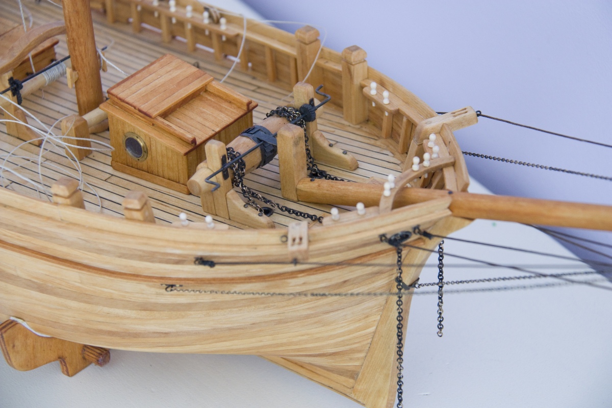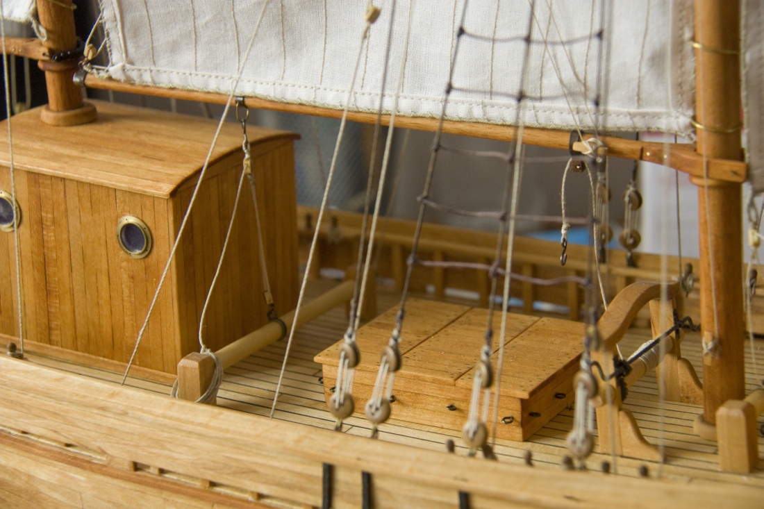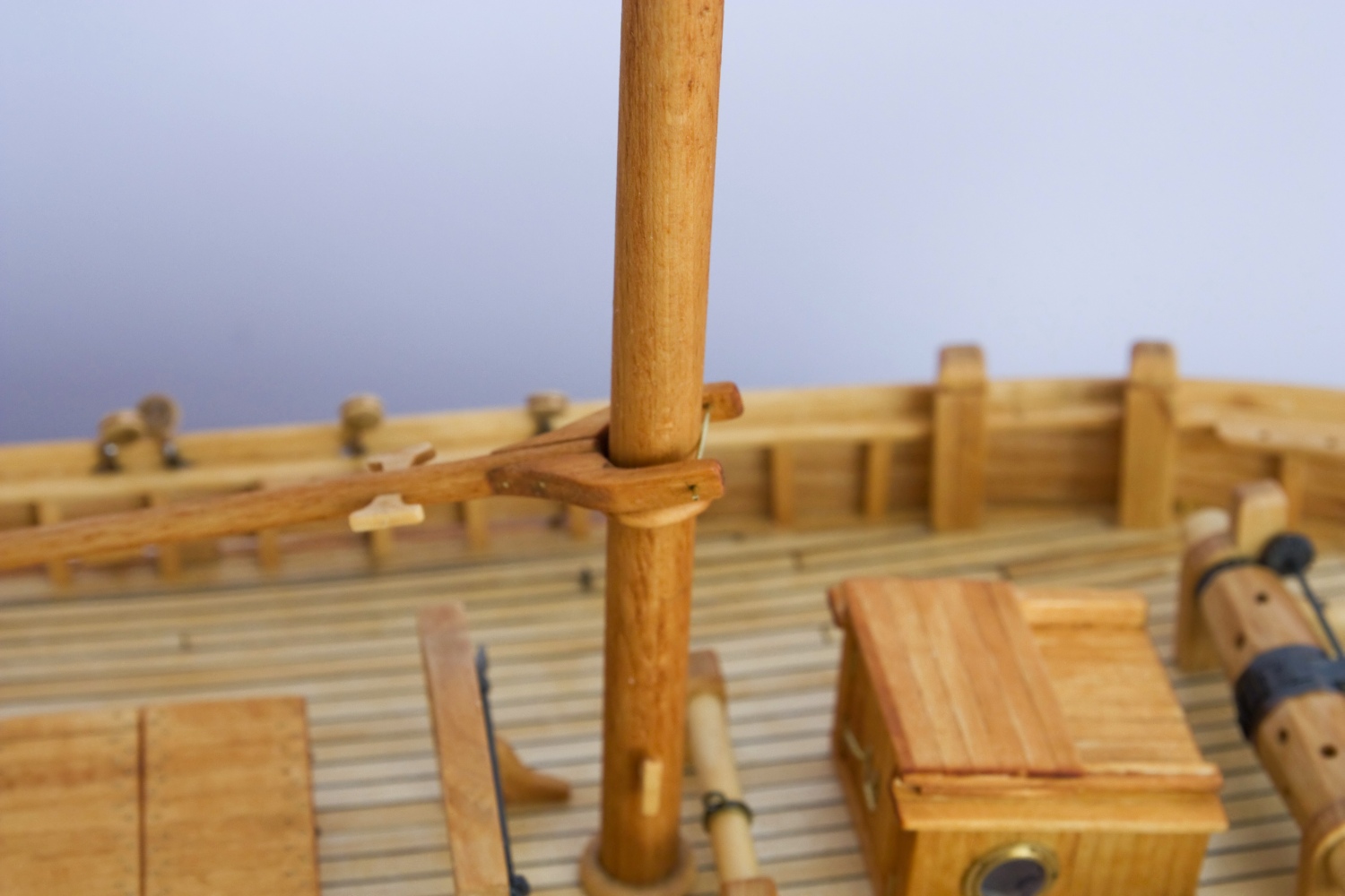 Kadłub wykonany jest z olchy a wszystkie nadbudówki z listewek z topoli i pomalowane bejcą olcha.