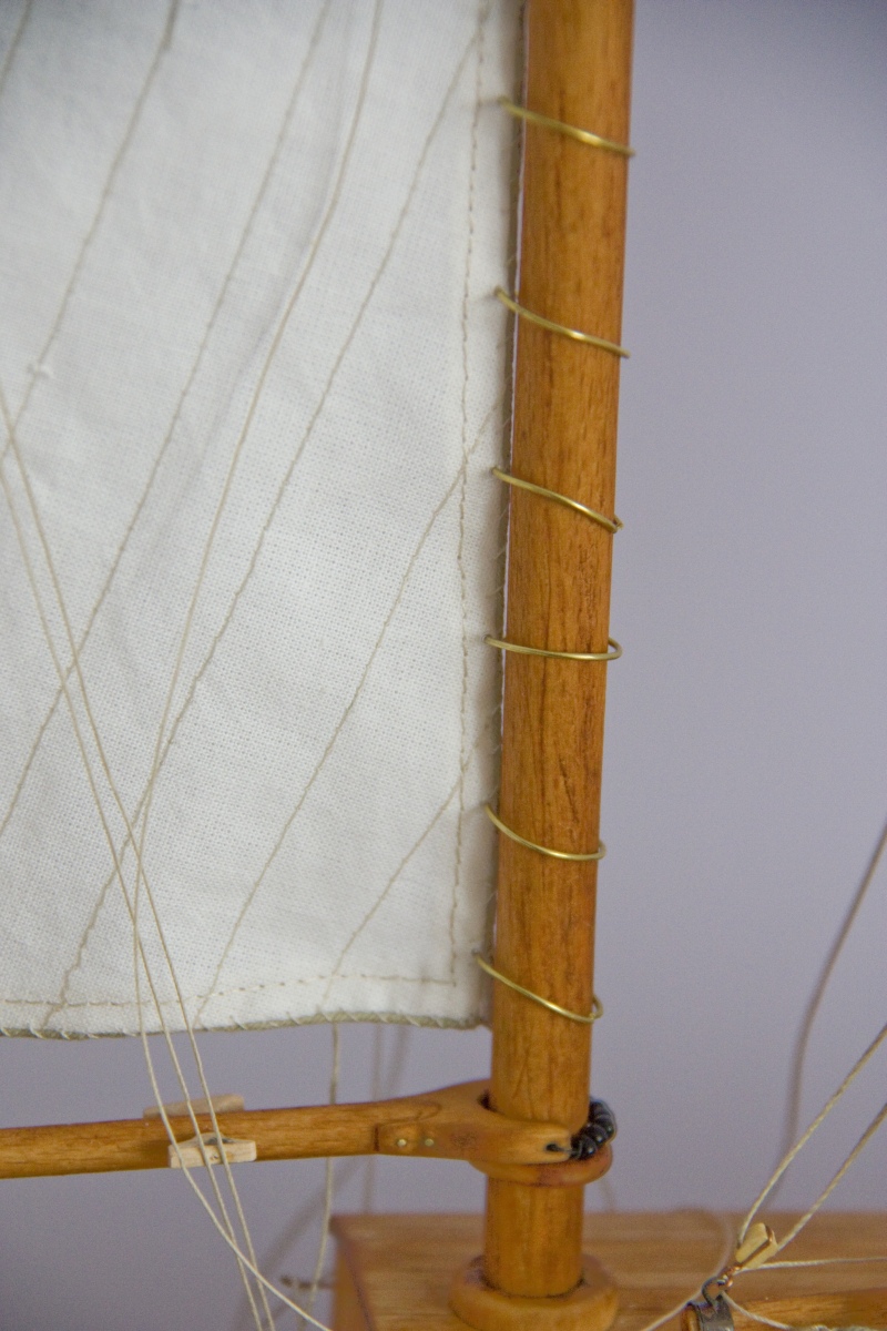 Trochę nietypowy sposób wykonywania olinowania, ale po doświadczeniach z Cutty Sark stwierdziłem, że tak będzie łatwiej. Powiesiłem żagle i zrobiłem olinowanie ruchome bez mocowania lin na stałe. Olinowanie stałe jest tylko wiązane do masztów.