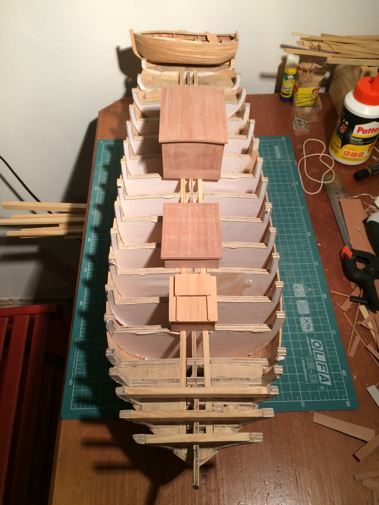 Zastanawiam, się nad sposobem zrobienia pokładu. Zostały mi listewki olchowe, które z racji różnych grubości, nie nadają się na burty, mam też sporo forniru. Chcę zrobić z nich fałszywy pokład, który po zeszlifowaniu pokryję fornirem. W kolejności, położenie fałszywego pokładu, wykończenie burt, wycięcie sklejkowych wsporników burt, wykończenie pokładu fornirem. Wstawienie wsporników zgodnych z planami.