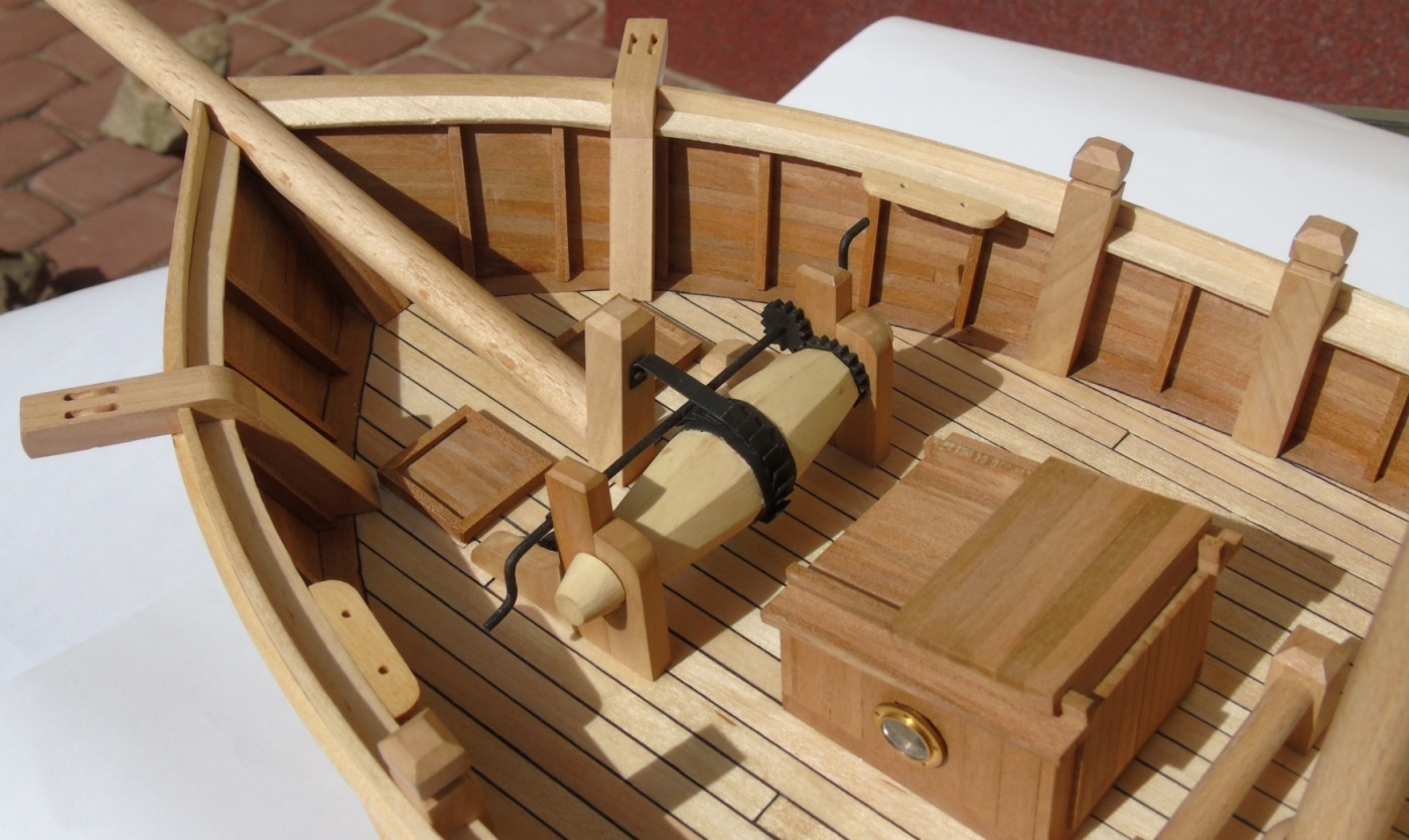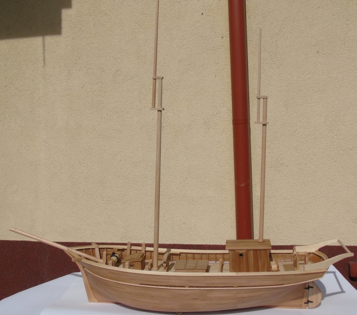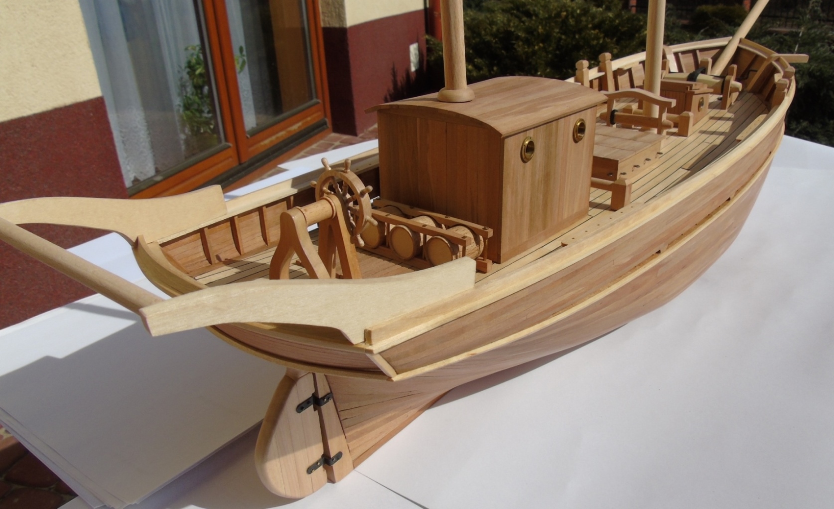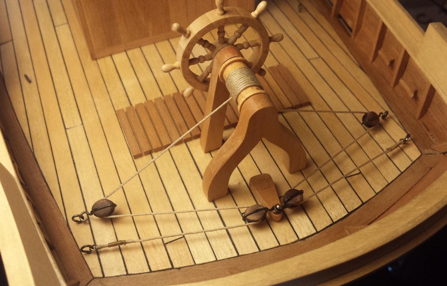 Teraz trochę szczegółów o samym modelu. Poszycie jest jednowarstwowe z gruszy, pokład z brzozy a imitacja uszczelnienia to czarny papier. Wyposażenie pokładu to również grusza a wszystkie jasne elementy to listwy lub fornir brzozowy. Maszty wykonane z wałeczków bukowych z marketu. Listwy z gruszy i brzozy oraz kawałek deseczki z gruszy zakupiłem oczywiście u Mirka. Pawęż wykonałem z forniru natomiast koło sterowe, beczki i bulaje zostały zakupione. Od Mirka będą również bloczki, jufersy, knagi, linki i może nagle. W trakcie wykonywania są okucia. Brak jeszcze haczyków, klamek itp.