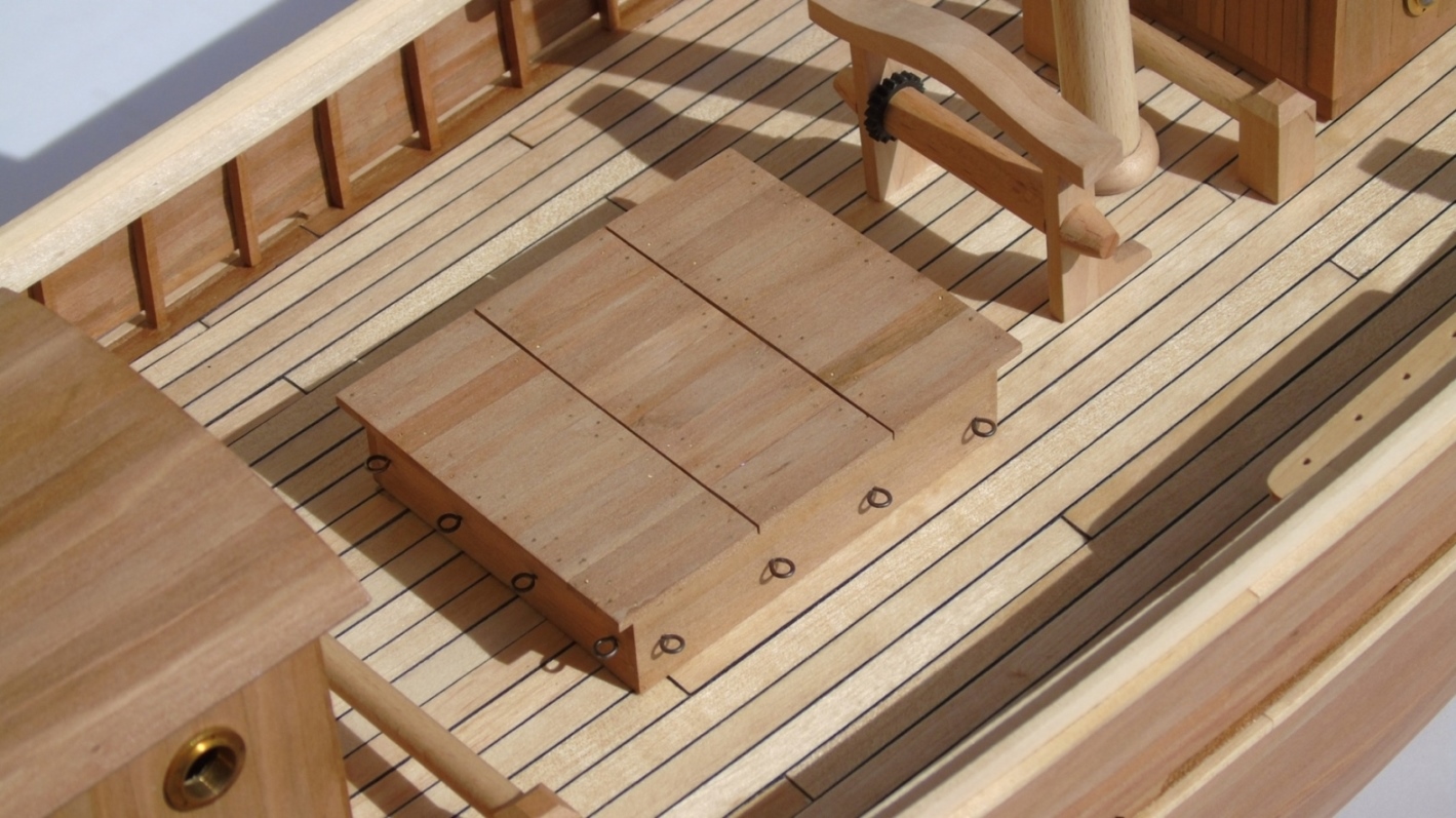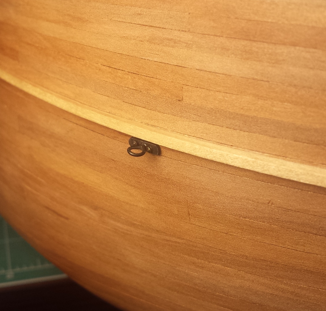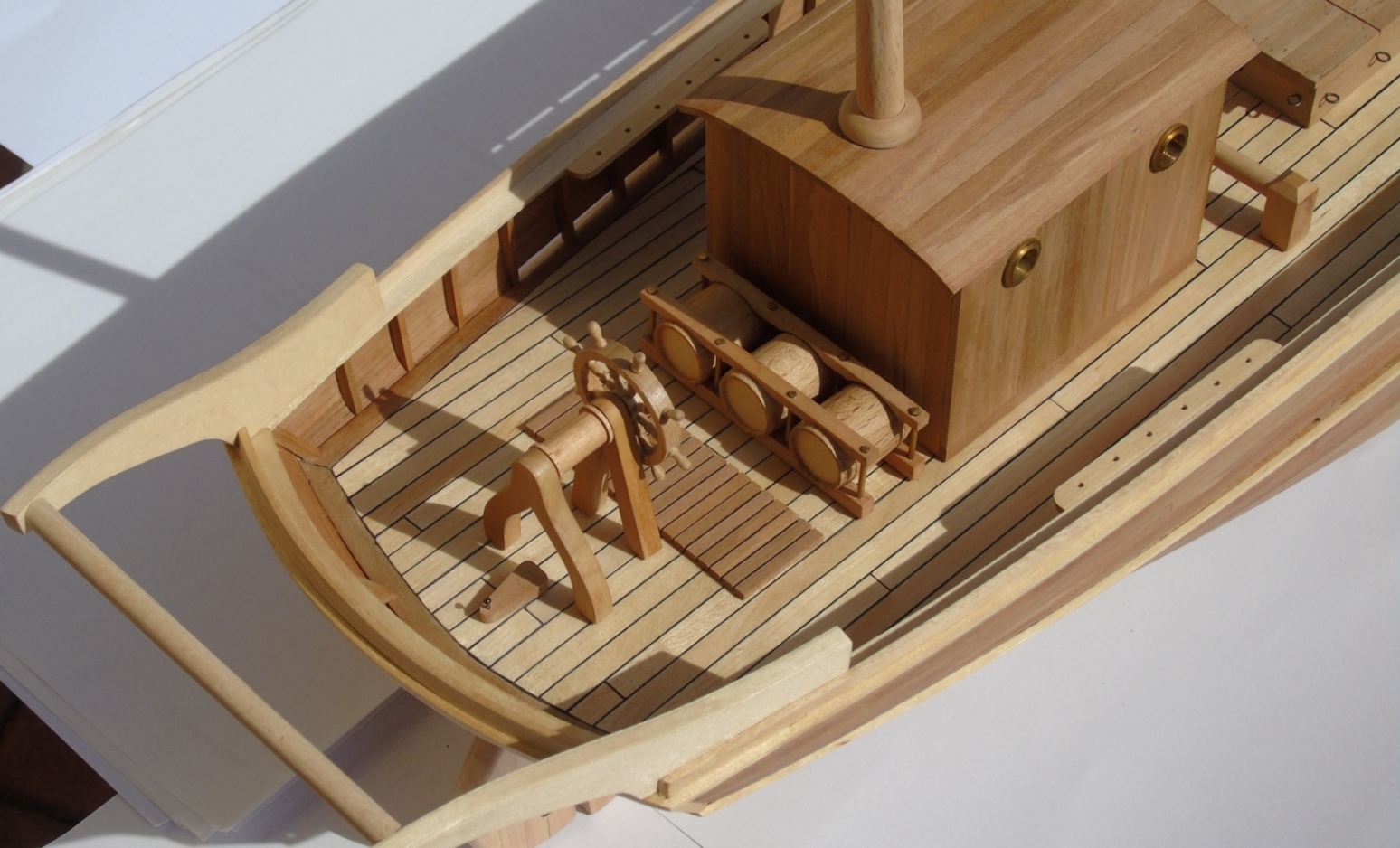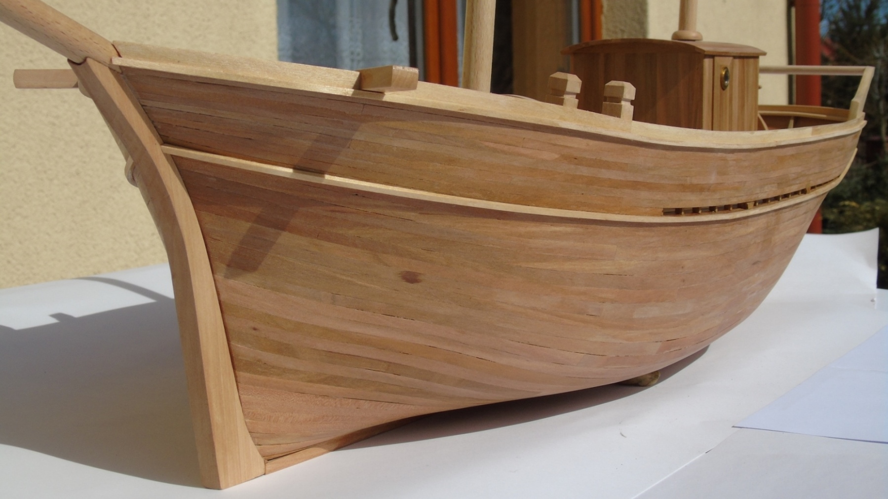 Teraz trochę szczegółów o samym modelu. Poszycie jest jednowarstwowe z gruszy, pokład z brzozy a imitacja uszczelnienia to czarny papier. Wyposażenie pokładu to również grusza a wszystkie jasne elementy to listwy lub fornir brzozowy. Maszty wykonane z wałeczków bukowych z marketu. Listwy z gruszy i brzozy oraz kawałek deseczki z gruszy zakupiłem oczywiście u Mirka. Pawęż wykonałem z forniru natomiast koło sterowe, beczki i bulaje zostały zakupione. Od Mirka będą również bloczki, jufersy, knagi, linki i może nagle. W trakcie wykonywania są okucia. Brak jeszcze haczyków, klamek itp.