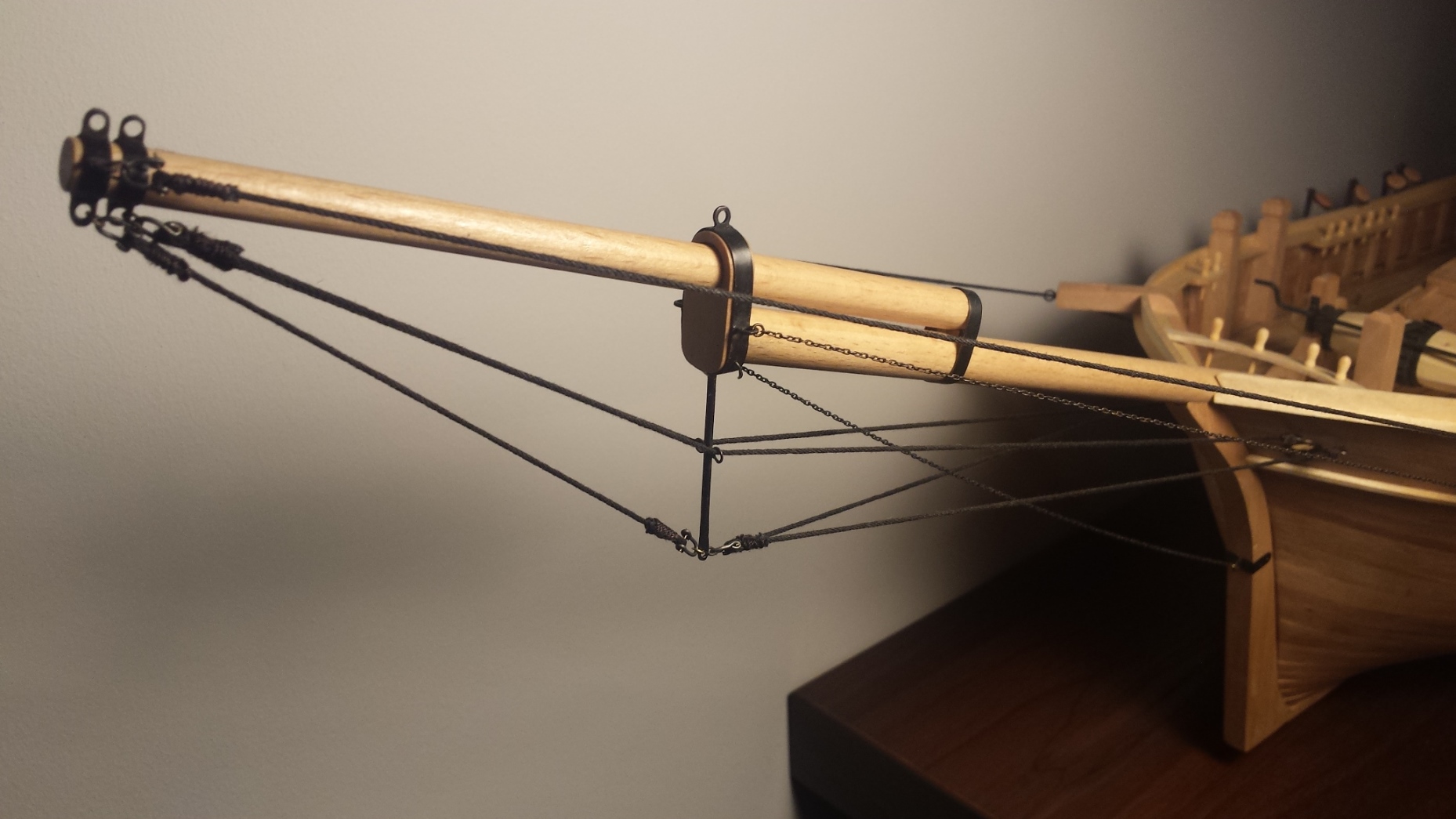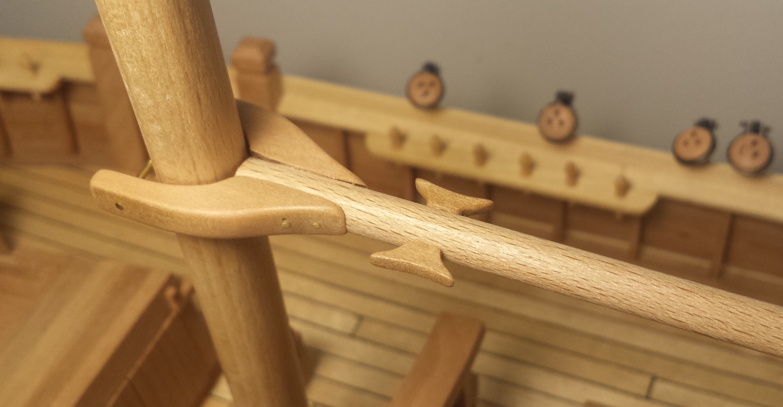 Poniżej kilka zdjęć z budowy masztów oraz bukszprytu. Drzewce to wałeczki z OBI, wstępnie heblowane mini strugiem a następnie szlifowane papierem. Metoda wielokrotnie pojawiała się forum.