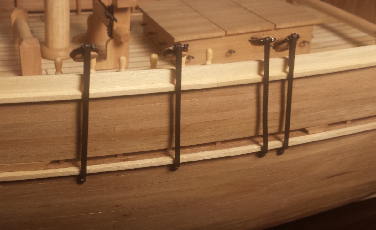 Wykonałem okucia bloczków oraz olinowanie steru. Sposób wykonania taki jak w relacji SM Romka. Ja użyłem drutu mosiężnego ponieważ akurat taki miałem. Wszystkie linki niestety kupne. Bloczki i jufersy są od Mirka.