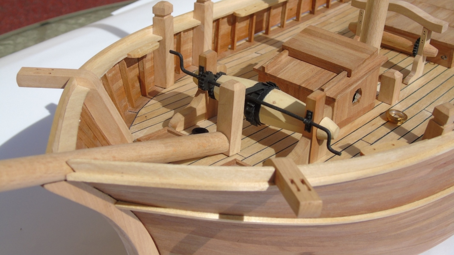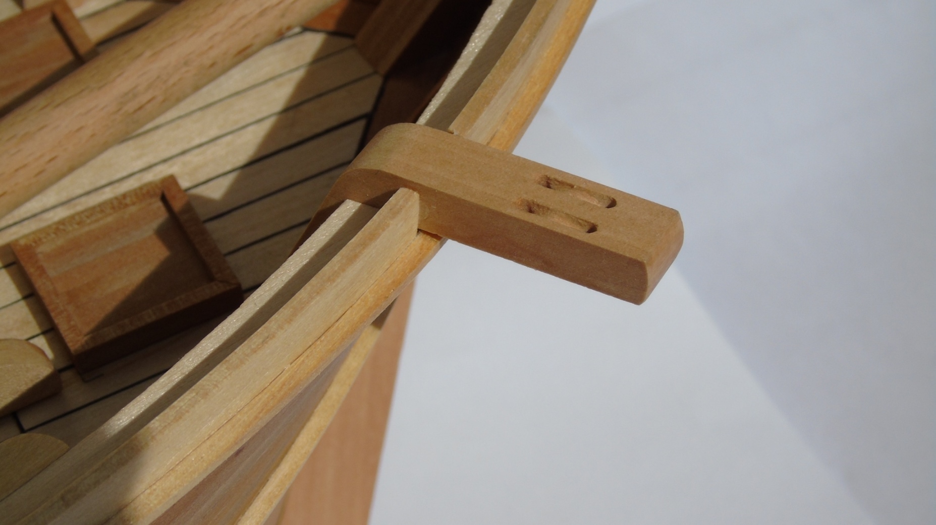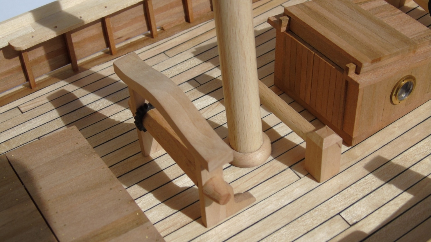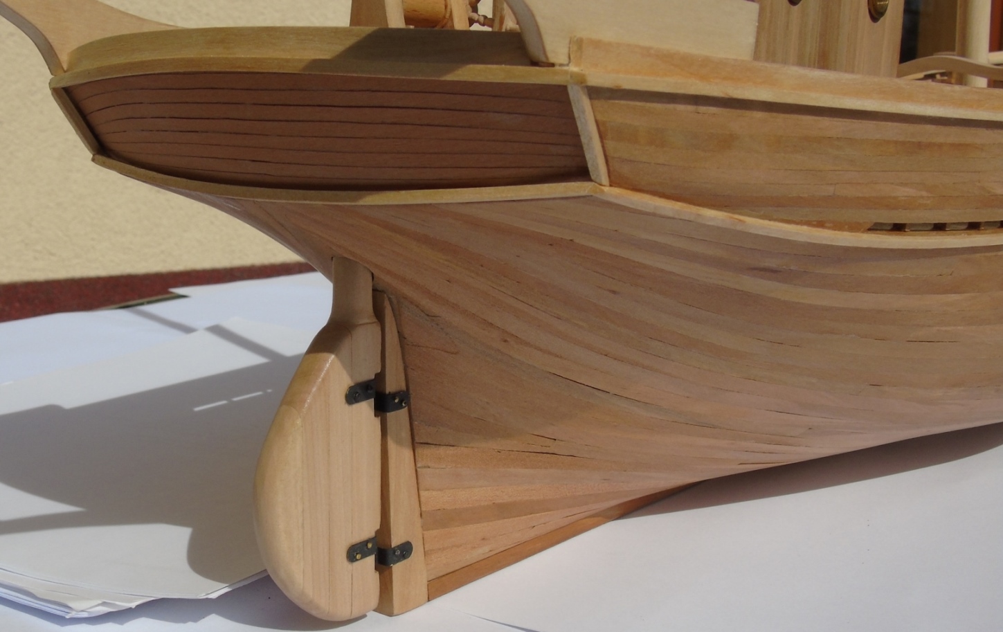 Teraz trochę szczegółów o samym modelu. Poszycie jest jednowarstwowe z gruszy, pokład z brzozy a imitacja uszczelnienia to czarny papier. Wyposażenie pokładu to również grusza a wszystkie jasne elementy to listwy lub fornir brzozowy. Maszty wykonane z wałeczków bukowych z marketu. Listwy z gruszy i brzozy oraz kawałek deseczki z gruszy zakupiłem oczywiście u Mirka. Pawęż wykonałem z forniru natomiast koło sterowe, beczki i bulaje zostały zakupione. Od Mirka będą również bloczki, jufersy, knagi, linki i może nagle. W trakcie wykonywania są okucia. Brak jeszcze haczyków, klamek itp.