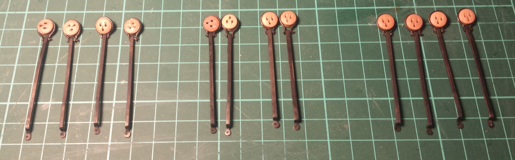 W ostatnim czasie udało mi się wymęczyć trochę okuć. W większości zrobione są z pasków mosiężnych oraz zszywek do pakowania paczek. Następnie czernione w zakupionej miksturze. Pomysł użycia zszywek jak i metody wykonania okuć zaczerpnięte z relacji Wurcelstocka.