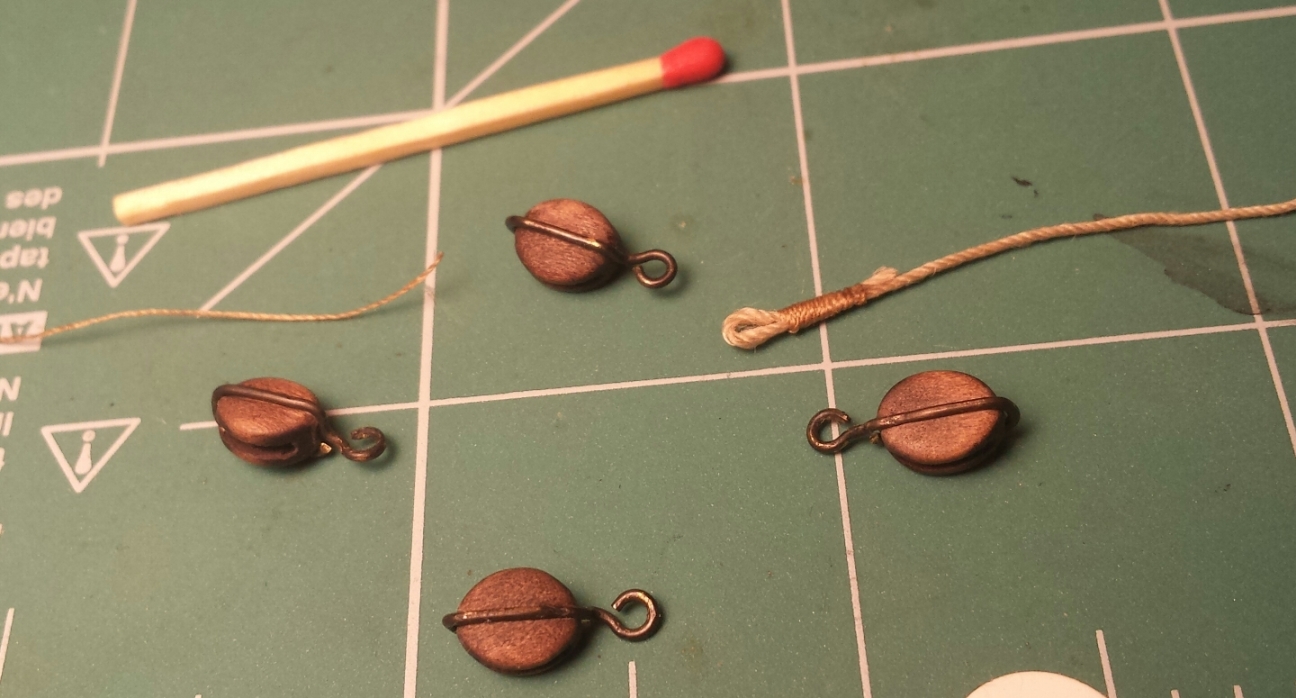 Wykonałem okucia bloczków oraz olinowanie steru. Sposób wykonania taki jak w relacji SM Romka. Ja użyłem drutu mosiężnego ponieważ akurat taki miałem. Wszystkie linki niestety kupne. Bloczki i jufersy są od Mirka.