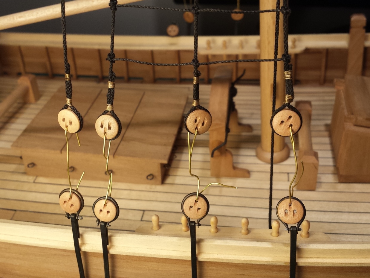 Pozostało jeszcze wykonać kilka sznurków na zwoje lin. Jak dotąd na olinowanie ruchome (łącznie z próbami) zużyłem szpule 500m nici 120. Pojedyncza lina skręcana jest z sześciu nitek (3x2).