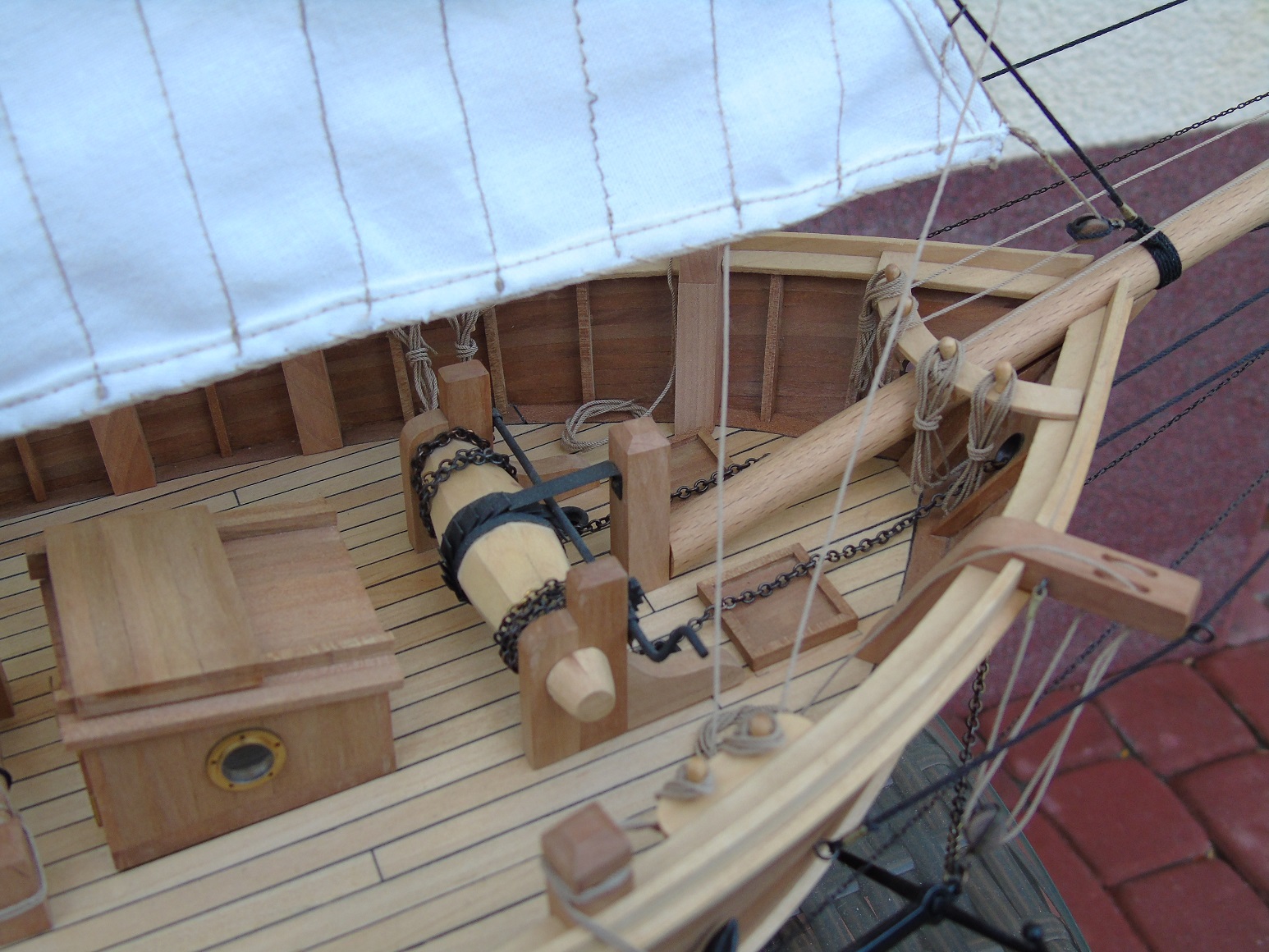 Na gotowym płótnie przykleiłem papier z narysowanymi żaglami podobnie jak wykonał to Prabut. Niestety użyłem papieru milimetrowego, który jest stosunkowo gruby. Miałem przez to problem z oderwaniem go po przeszyciu. Samo szycie wykonała znajoma krawcowa. Niestety nie posiadam maszyny do szycia. Liklinę przeszyłem ręcznie na okrętkę. Wszystkie żagle są już powieszone i większość linek już zawieszona. Poniżej kilka zdjęć, może komuś się to przyda. Niestety są słabo doświetlone a nie chce używać lampy. Jak będzie słonecznie i znajdę czas to zrobię kilka lepszych zdjęć.