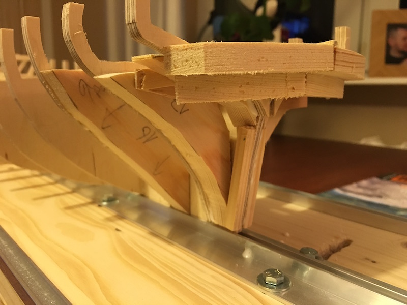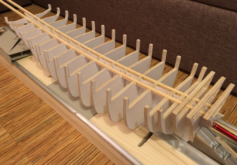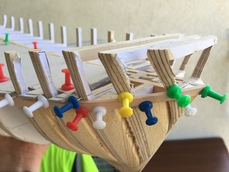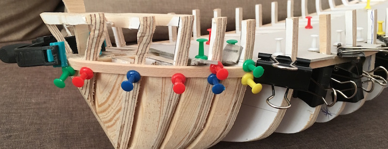 Obecnie jestem na etapie budowy szkieletu - zostały mi 2 wręgi do wklejenia. Potem listewki wzmacniające szkielet, wypełnienie rufy i dziobu oraz szlifowanie tego wszystkiego.