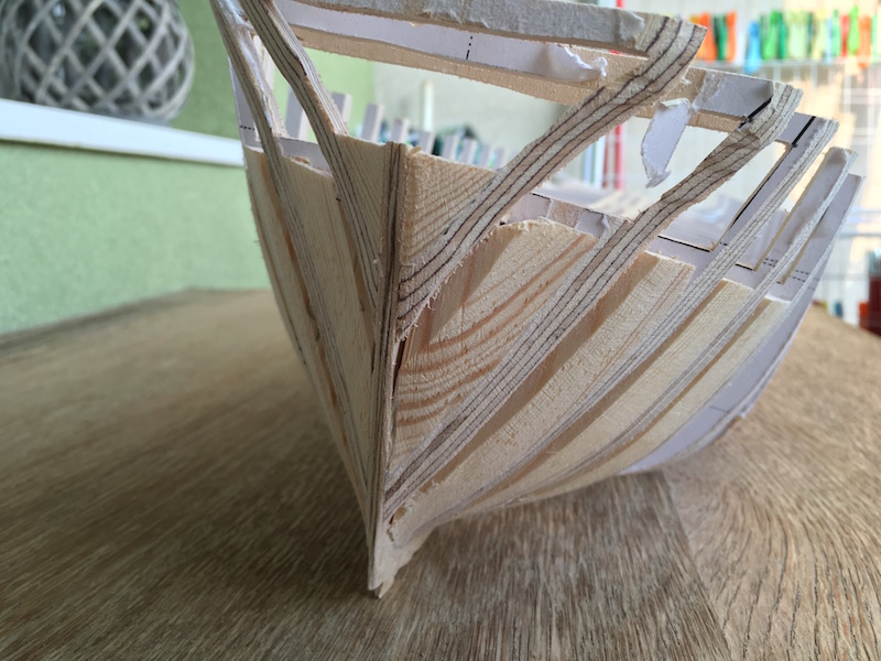 Nie spiesz się.Jeżeli kładziesz poszycie na wręgach,te muszą idealnie współgrać ze sobą.Tu widać uskoki.Szczególnie przy rufie.Posprawdzaj to cienką listewką a nie tekturką.Pozdrawiam.K.