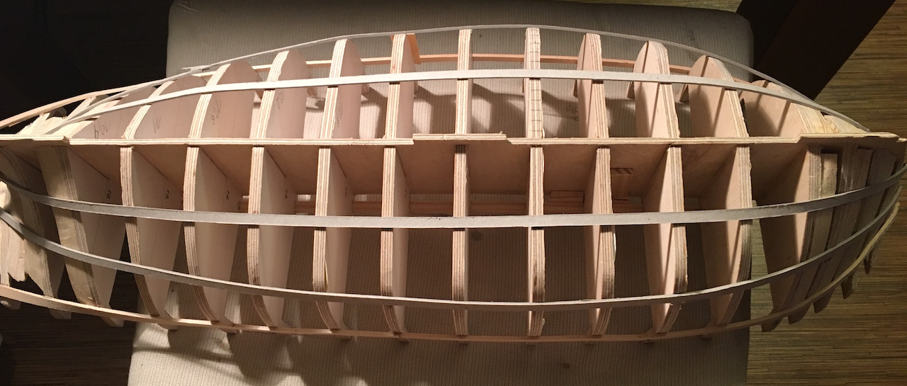 Witam, przykleiłem battens'y z tekturki 1mm. Długości wręg mierzyłem paskiem z papieru milimetrowego i dzieliłem je na 3 równe odcinki. Wyznaczone punkty połączyłem poszczególnymi paskami tektury. Teraz pomalutku będę dopasowywać listewki poszycia.