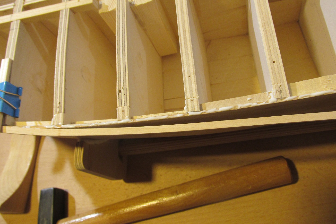 3 milimetrowe listwy z olchy nie chcą się tak łatwo giąć, dlatego zmuszony byłem do sztukowania w okolicy dziobu.